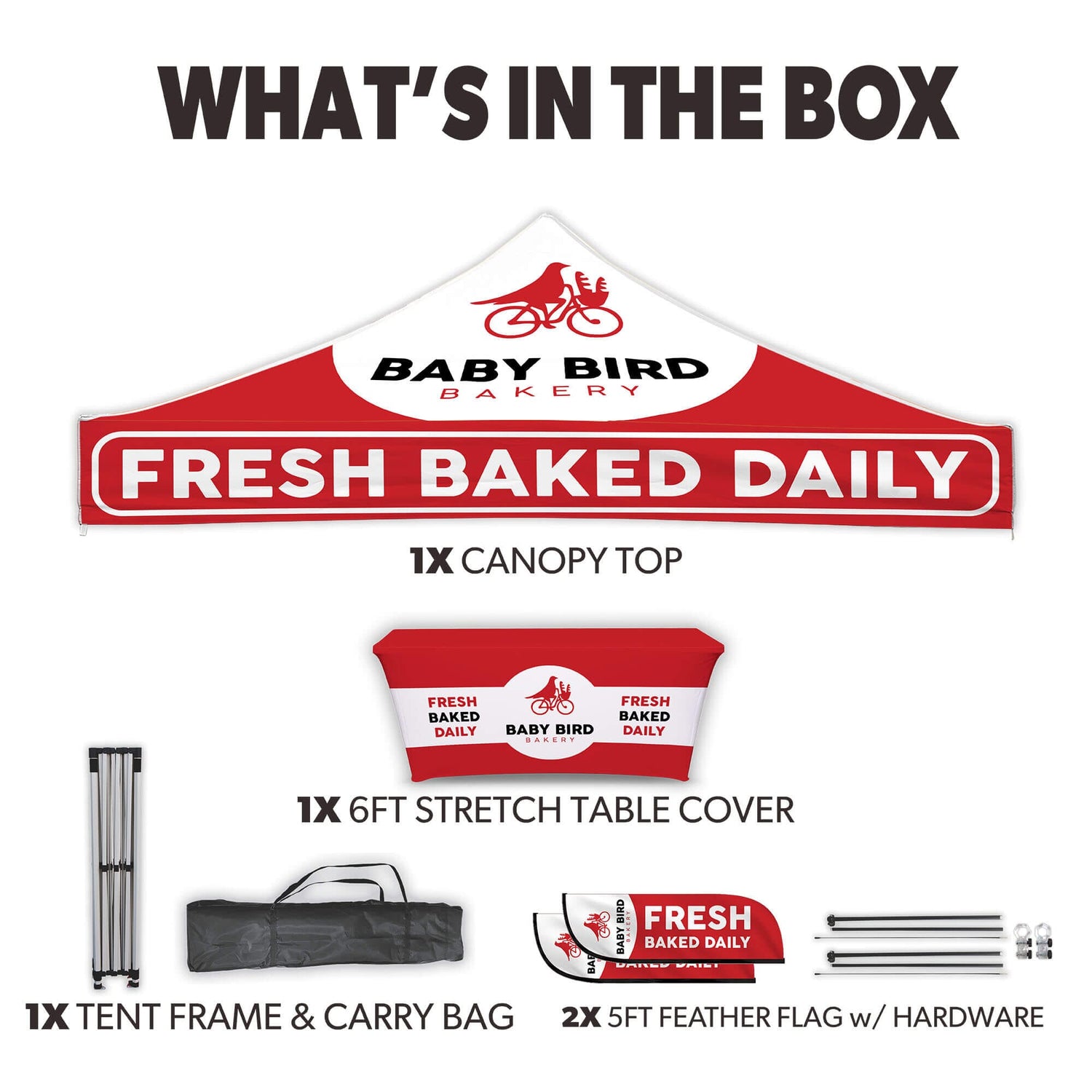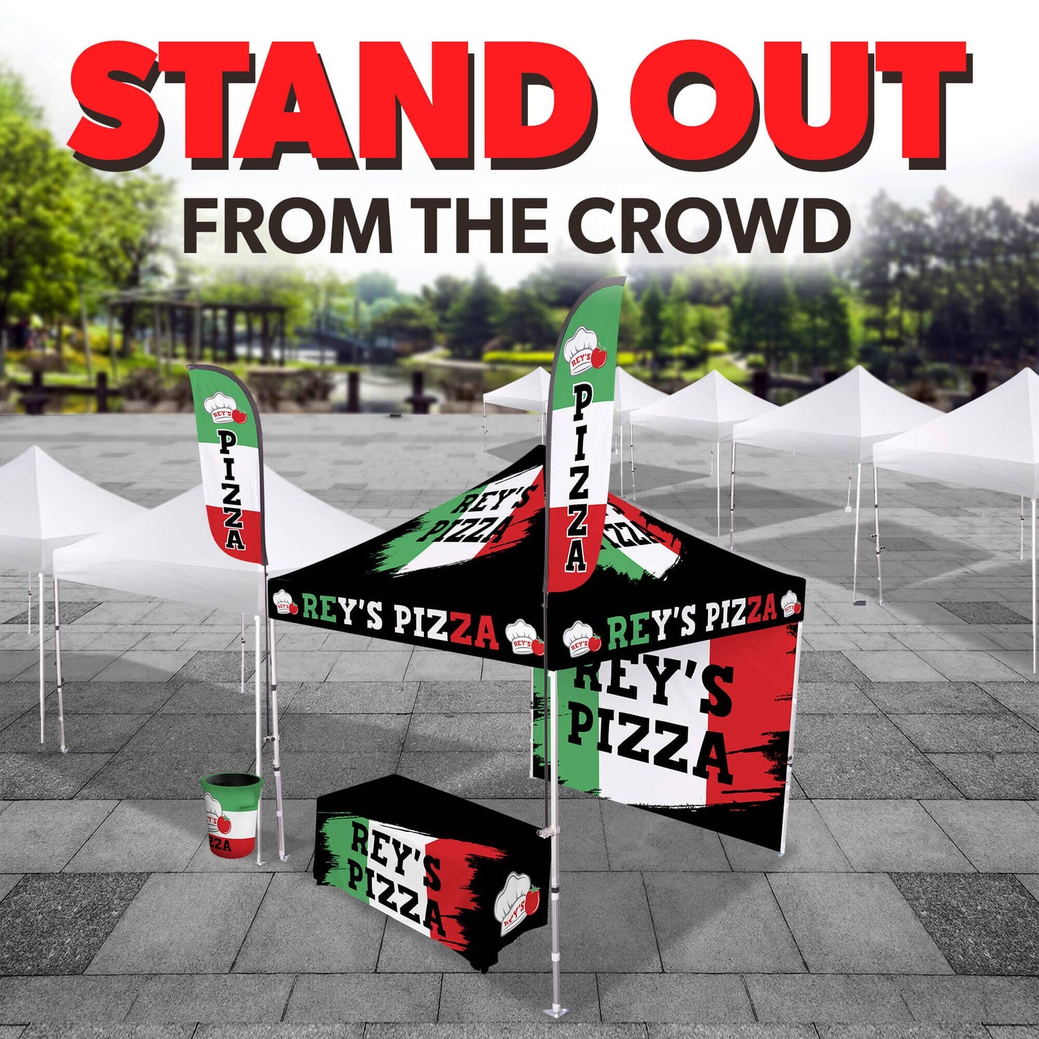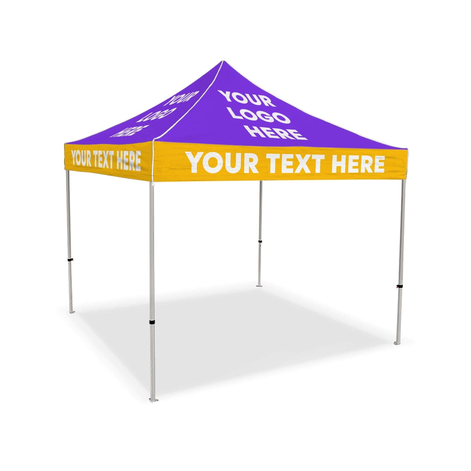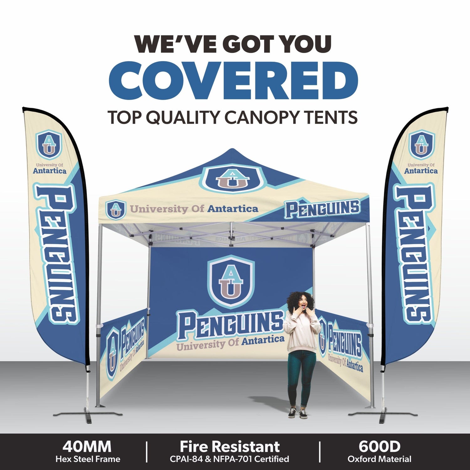 Canopy tents are not only mobile shelters but have now become a fully customizable advertising solution. With the ability to have your company or brand’s logo and messaging printed onto all surfaces of the tent package you choose, as well as a host of additional complimentary custom products like table covers and feather flags, you will have the ability to shelter your team and boldly display your branding and messaging in a clean and professional manner. Select the package of your choice above to get started.