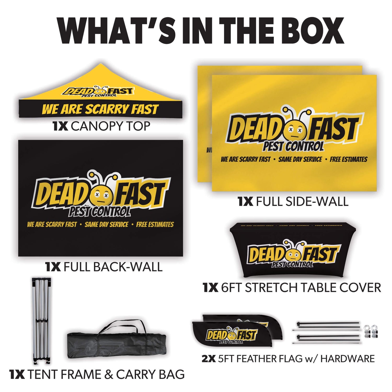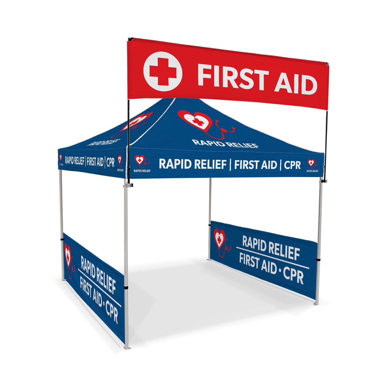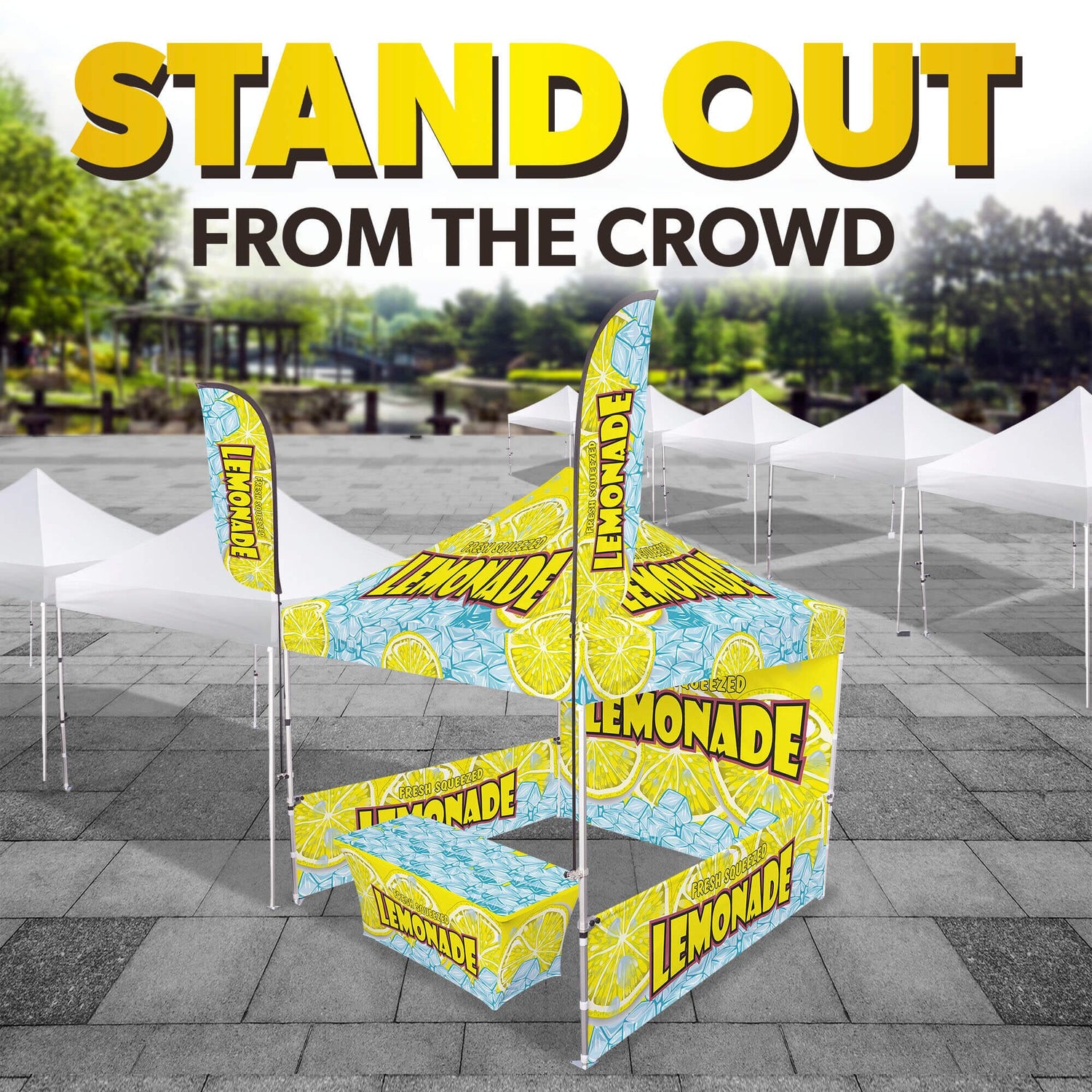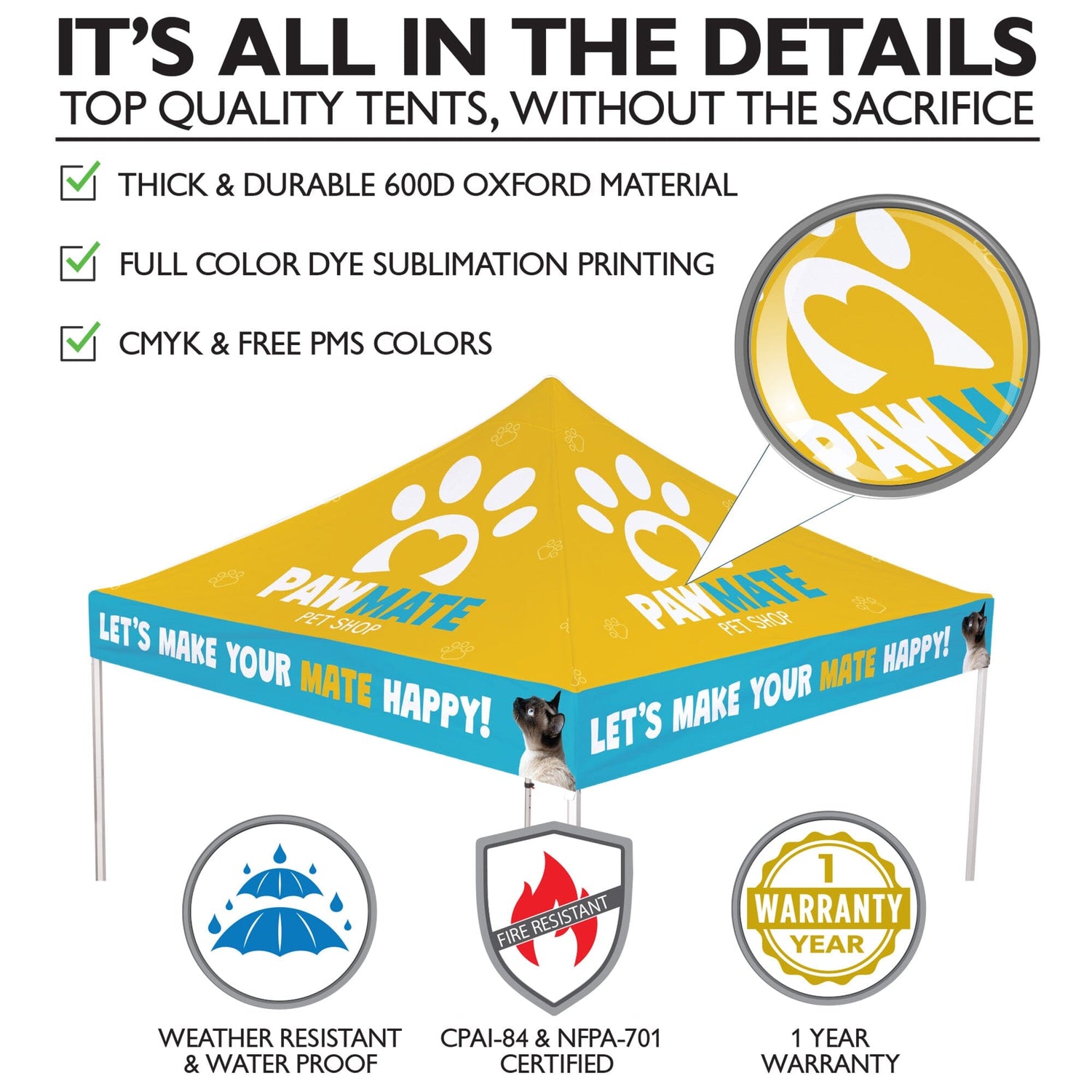 Canopy tents are not only mobile shelters but have now become a fully customizable advertising solution. With the ability to have your company or brand’s logo and messaging printed onto all surfaces of the tent package you choose, as well as a host of additional complimentary custom products like table covers and feather flags, you will have the ability to shelter your team and boldly display your branding and messaging in a clean and professional manner. Select the package of your choice above to get started.