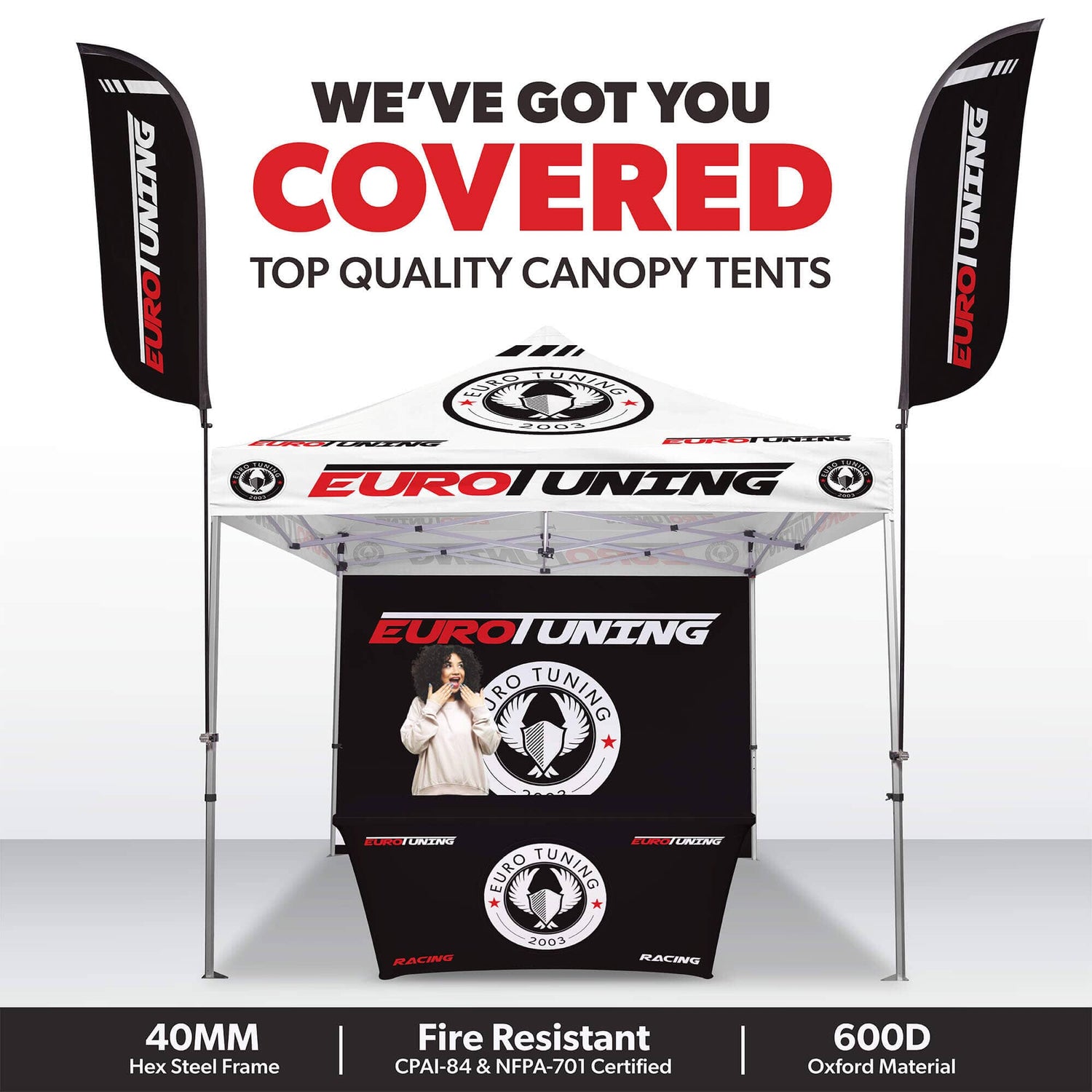 Custom Canopy Tent with Back Wall, Feather Flags & Table Cover