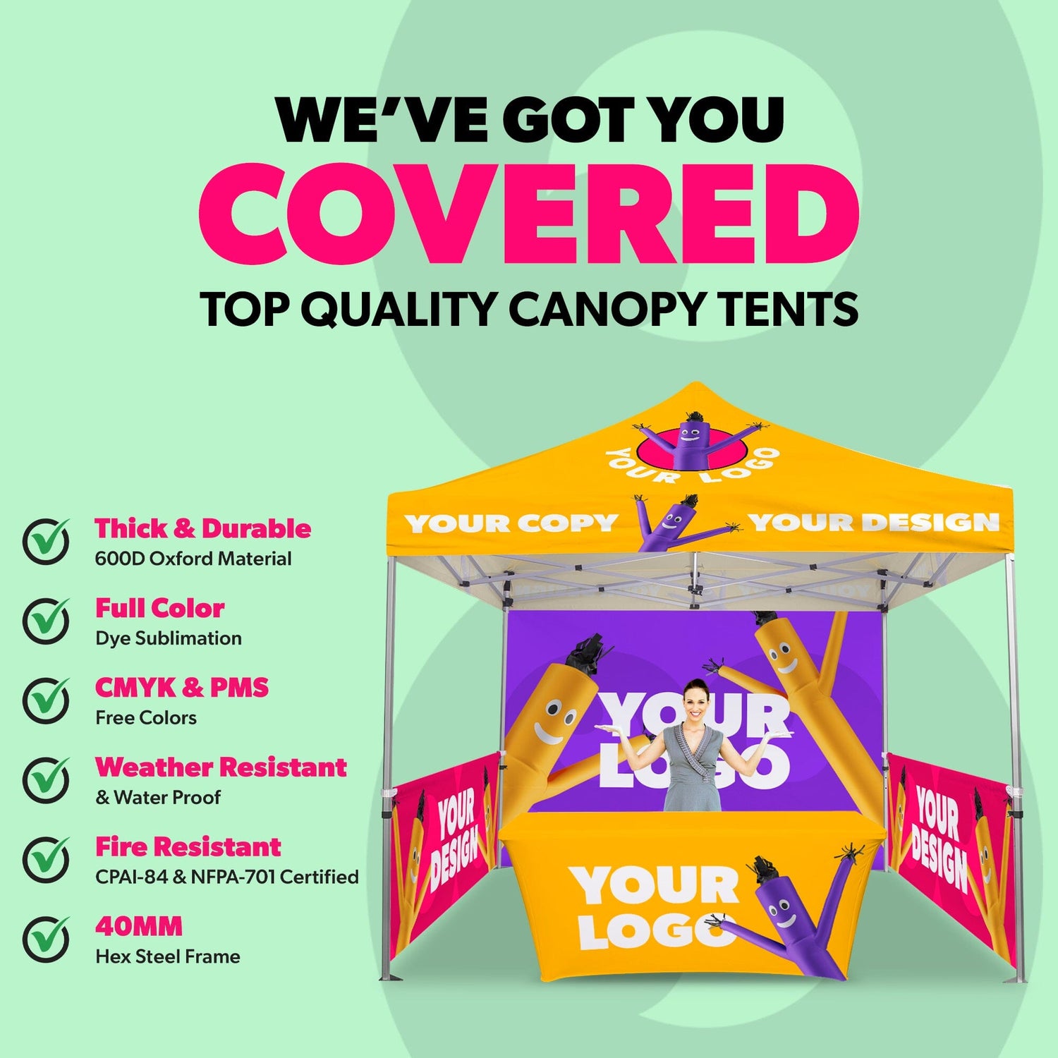 Canopy tents are not only mobile shelters but have now become a fully customizable advertising solution. With the ability to have your company or brand’s logo and messaging printed onto all surfaces of the tent package you choose, as well as a host of additional complimentary custom products like table covers and feather flags, you will have the ability to shelter your team and boldly display your branding and messaging in a clean and professional manner. Select the package of your choice above to get started.