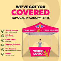 We use a dye sublimation process which gives the tent a clean and high-quality print look. This method is used with heat transfer creating vibrant colors and a special laminate layer providing additional production against UV and moisture. This printing method ensures a high-quality look and offers durability to endure normal outdoor weather conditions.