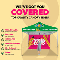 Start with your custom canopy top, printed in vibrant full color on durable, weather-resistant 600D Oxford fabric. Choose to include our commercial-grade steel frame for unmatched strength and stability. Then add your custom table cover - available in a sleek 6ft Stretch or classic 6ft Throw style - and finish your look with a single- or double-sided back wall for extra branding and shade.