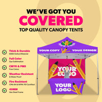 We use a dye sublimation process which gives the tent a clean and high-quality print look. This method is used with heat transfer creating vibrant colors and a special laminate layer providing additional production against UV and moisture. This printing method ensures a high-quality look and offers durability to endure normal outdoor weather conditions.