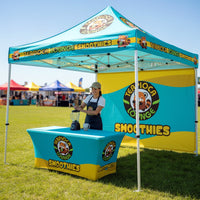 Start with your custom canopy top, printed in rich, full color on durable, weather-resistant 600D Oxford fabric. Pair it with our heavy-duty steel frame for unbeatable strength and easy setup. Add a single- or double-sided back wall to boost your branding and provide shade, and complete your display with a custom table cover - available in sleek 6ft Stretch or classic 6ft Throw styles.