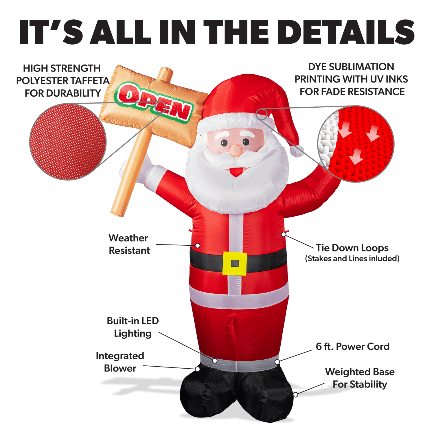 The 6ft Santa Lawn Inflatable by LookOurWay features a timeless Santa Clause design that will let your customers know that you are open and ready for business! Designed to capture attention with its vibrant colors, charming details and built-in LED Lights. Each 6ft lawn inflatable features a fully integrated "Open" Sign that will instantly add charm and holiday cheer to your storefront.