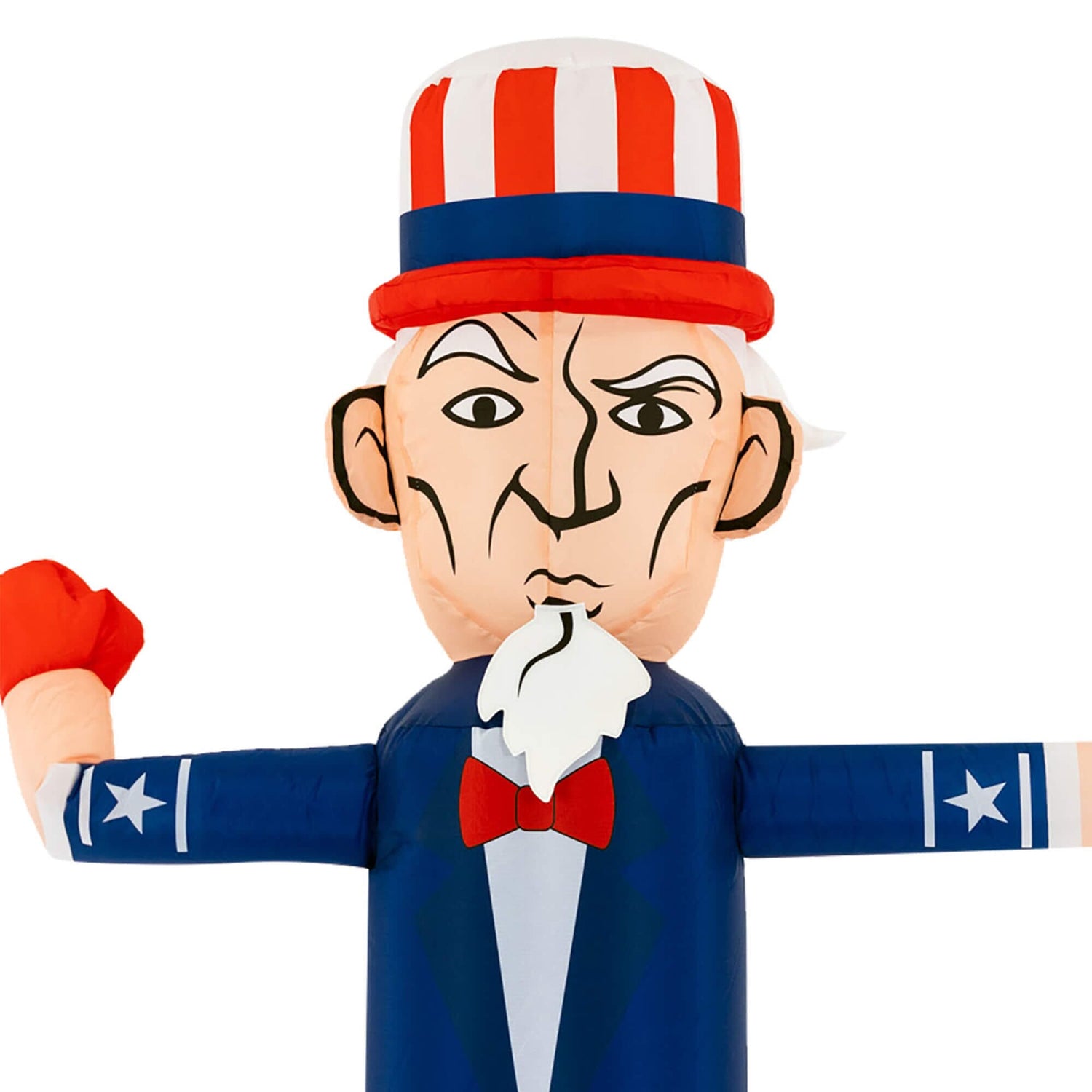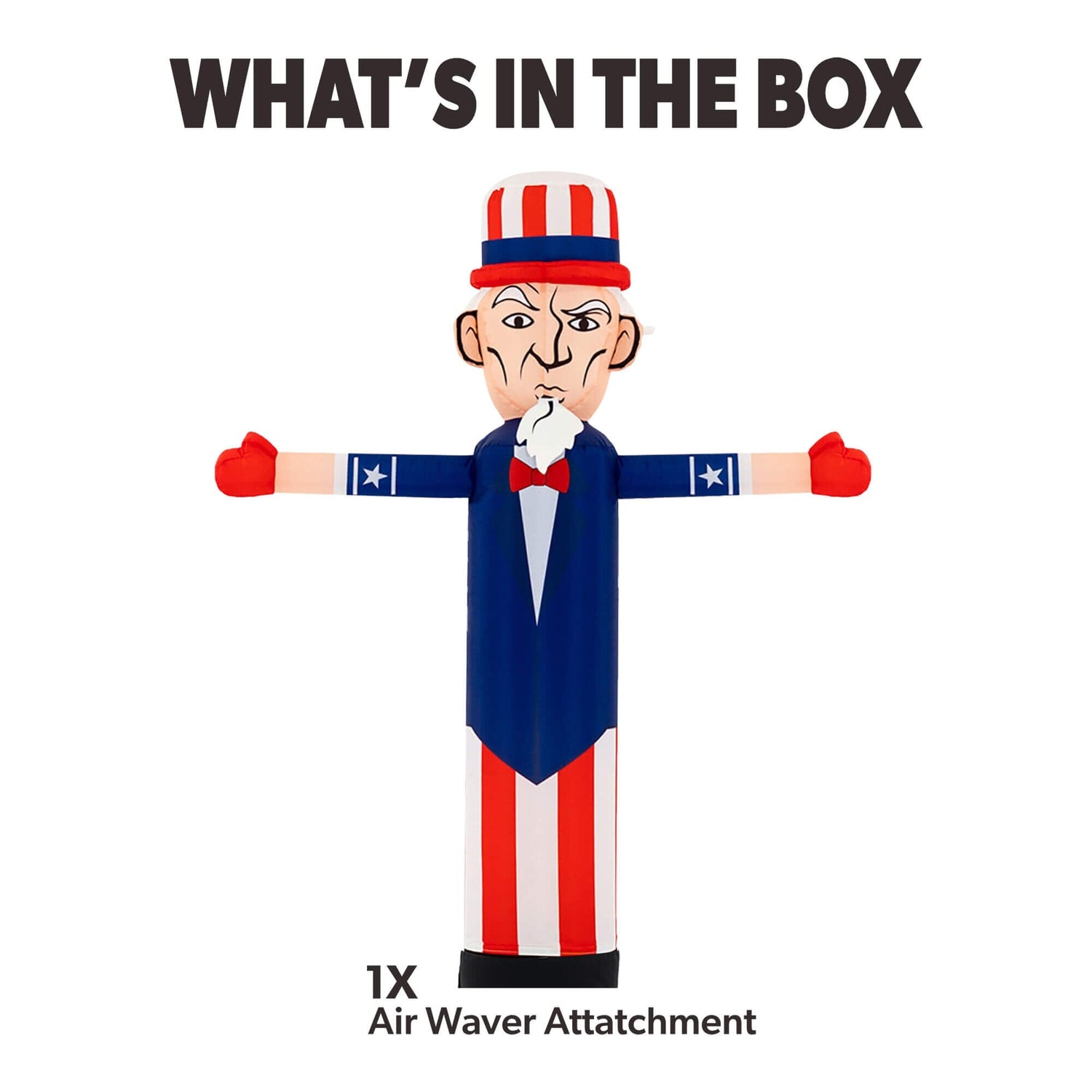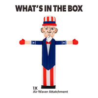 This Uncle Sam Air Wavers® is perfect for advertising your business and is sure to bring in the customers! Uncle Sam waves his arm up and down while standing 6ft tall. With his red, white, and blue suit, he's ready to wave down the customers to your business. Use this Uncle Sam inflatable tube man to advertise Memorial Day, Labor Day, and Independence Day sales!