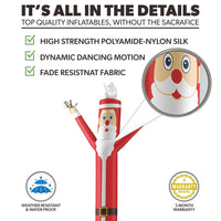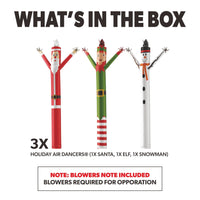 Bring big holiday energy to your business with the Air Dancers® Inflatable Tube Man Holiday 3-Pack! Featuring Santa, Elf, and Snowman designs, each dancer is wrapped in 360˚ of festive fun to grab attention from every angle. Perfect for Christmas sales, tree lots, town events, and more, these inflatable characters are a guaranteed crowd-pleaser. The 6ft size is great for indoor spaces like retail floors and showrooms, while the 10ft and 20ft options are ideal for outdoor displays that draw in holiday shoppers from far and wide.