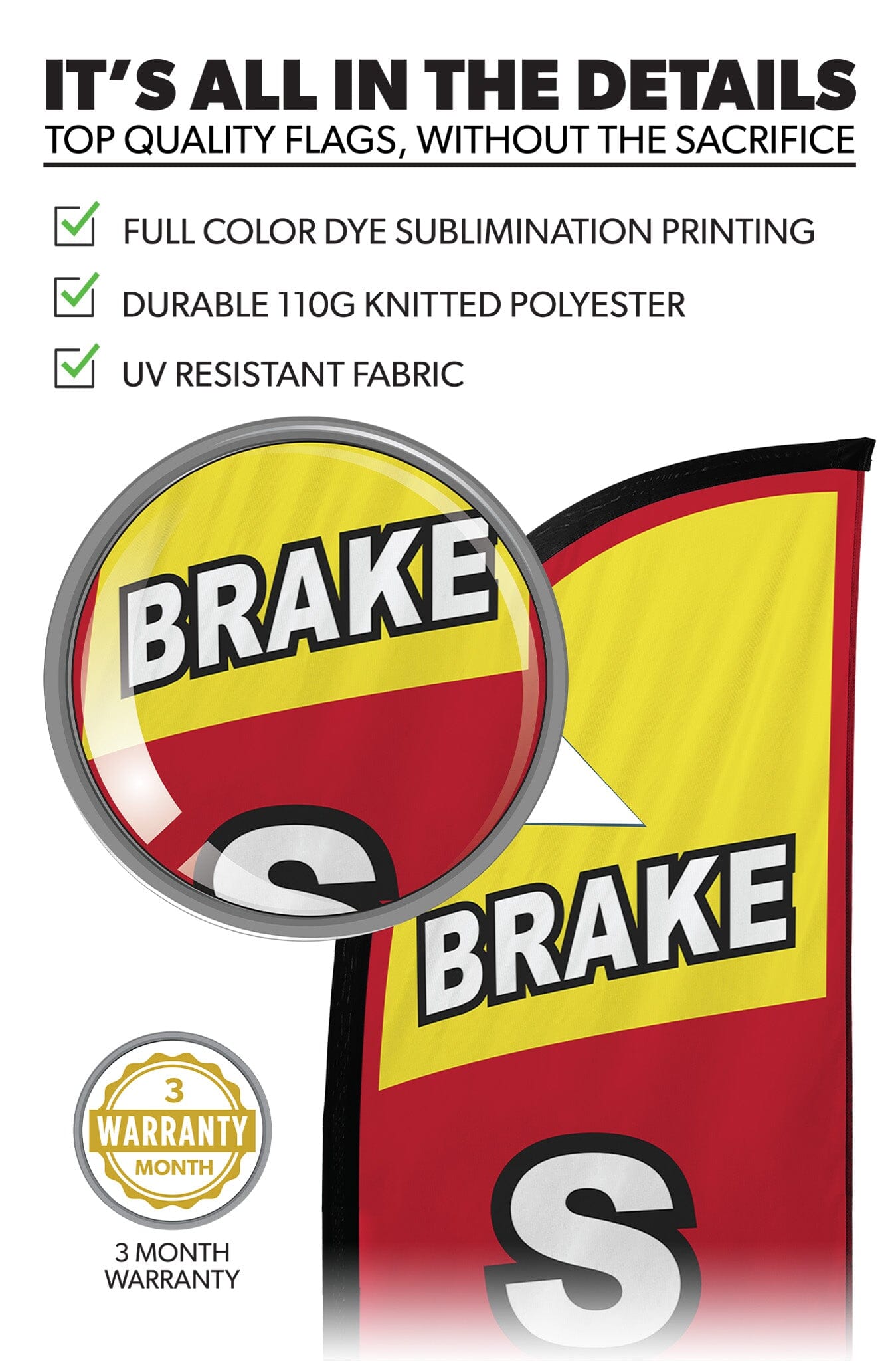 All our flags are made with durable, knitted polyester. Our predesigned options are available in 115g polyester and custom flags are available in 100g material. This material is UV-resistant and rated for wind speeds up to 25 mph. The material is also weather-resistant, but we recommend not displaying our flags outdoors on rainy or snowy days to extend their lifespan.