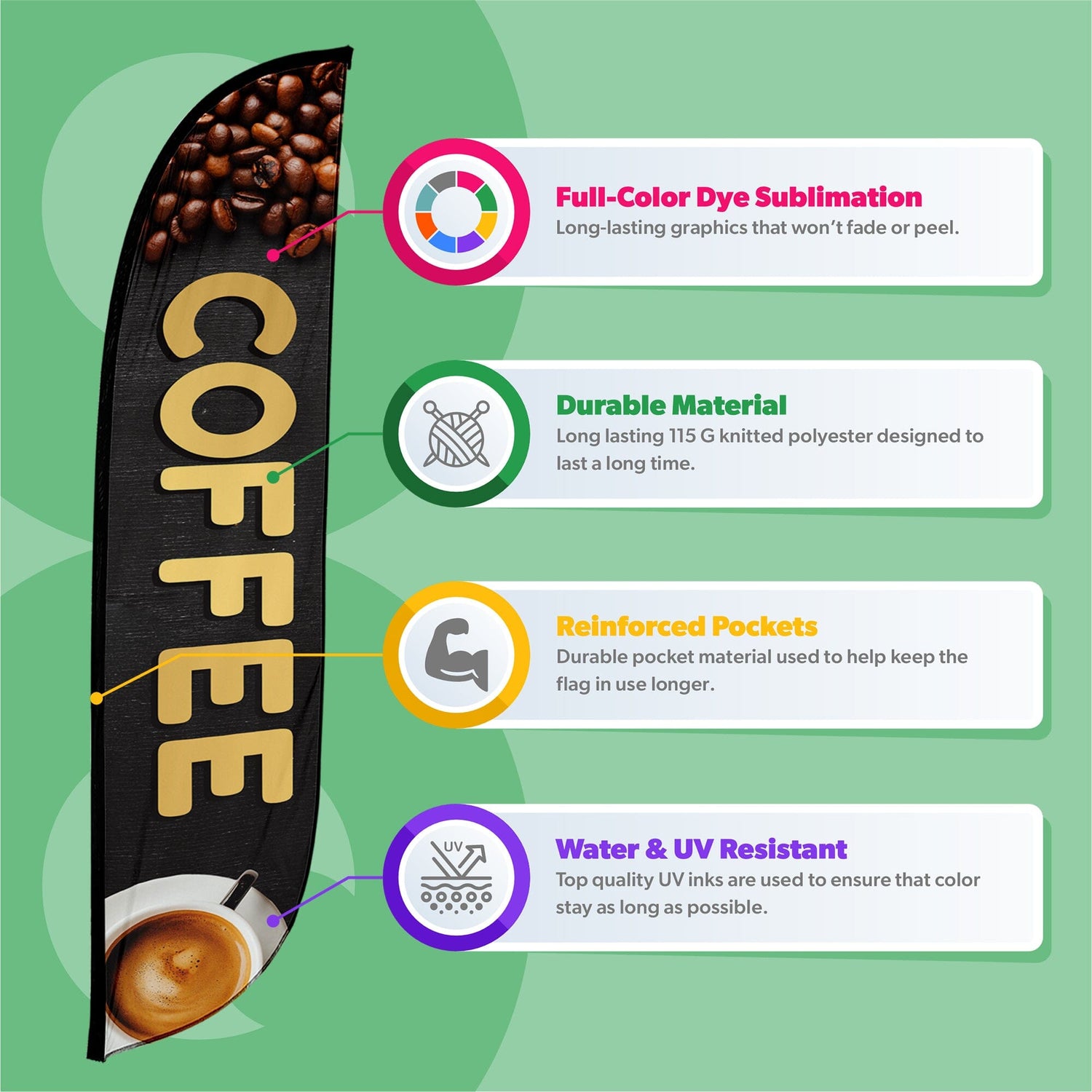 Wake up your storefront with this rich and inviting golden brown Coffee feather flag, designed to turn heads and draw in caffeine lovers from all directions. Featuring bold white “COFFEE” lettering, a splash of fresh brew, and a background of realistic roasted coffee beans, this flag practically smells like a fresh cup!