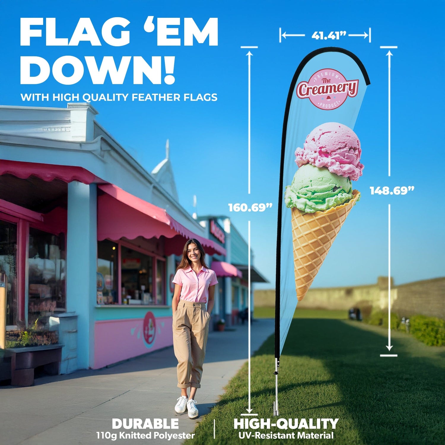 Choose to order the flag-only (fits our same-size teardrop flag hardware) or pair with a ground spike, cross base, or both depending on your setup needs. Available in 7ft, 9ft, and 12ft sizes to match any display.