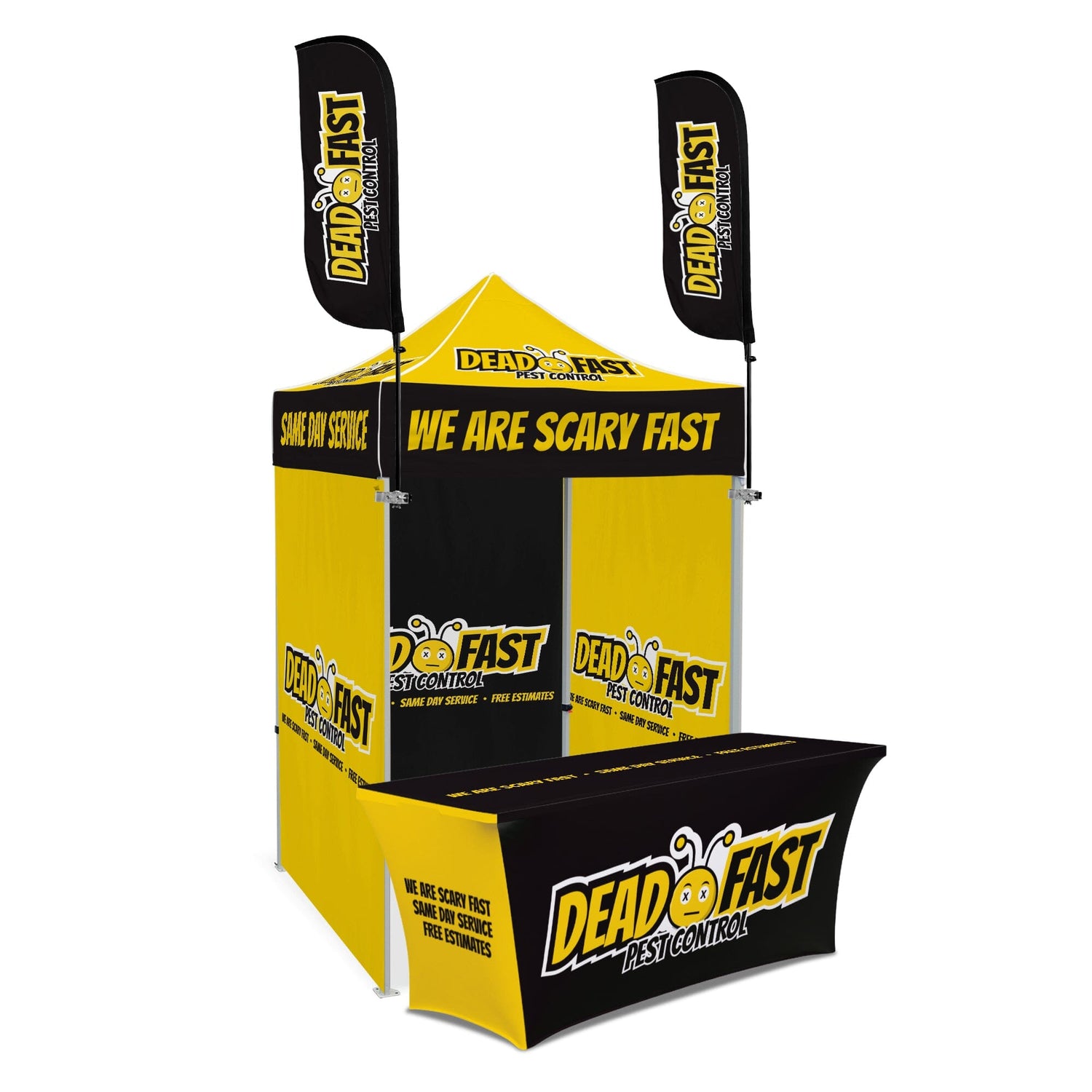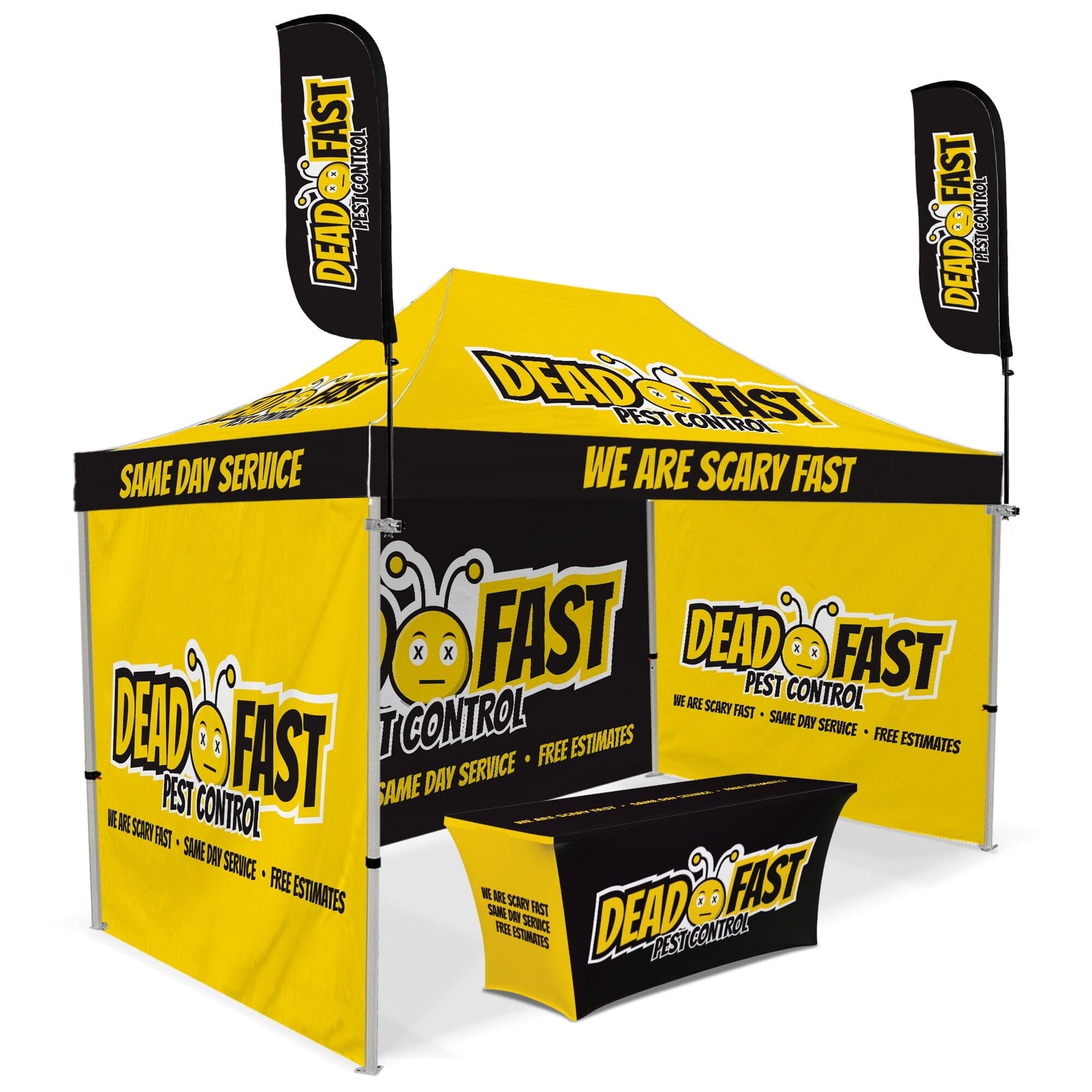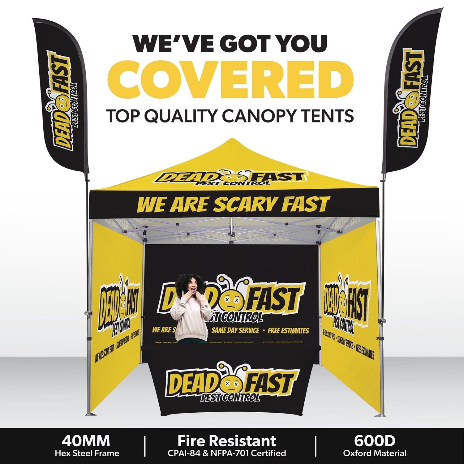 Custom Canopy Tent with Three Back Walls, Feather Flags & Table Cover