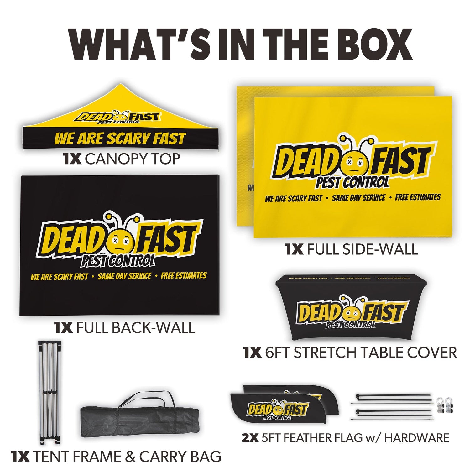 Make your brand stand out with the Custom Canopy Tent Package featuring Three Full Walls, a Full Back Wall, 6ft Stretch Table Cover, and 5ft Custom Feather Flags Mounted to the Tent from LookOurWay—an all-in-one solution designed for complete coverage, maximum visibility, and a polished, professional presence. This package includes a fully customizable canopy top and three full custom walls crafted from durable, water-resistant PU-coated 600D Oxford material, all printed in vibrant full color using advanced dye sublimation (CMYK + PMS) for bold, eye-catching graphics. All fabric components—including the canopy and walls—are fire resistant (CPAI-84 & NFPA-701 certified) and supported by a commercial-grade steel frame with 40mm HEX legs, ensuring superior strength and stability for both indoor and outdoor events. The package also includes a custom 6ft stretch table cover designed to perfectly fit standard folding tables while showcasing your logo or branding in full color. To boost brand exposure even further, it features a set of 5ft custom feather flags, professionally printed and securely mounted to the tent frame for high-impact visibility. A nylon carry bag is included for easy transport. Perfect for trade shows, farmers markets, and promotional events, this tent package comes with free professional design services to help bring your vision to life.