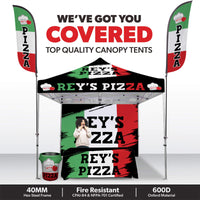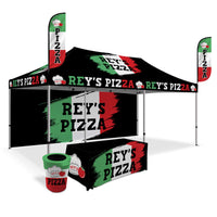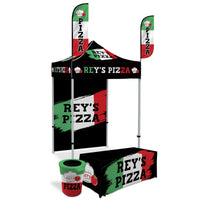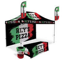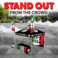 The Custom Canopy Tent Festival Event Package by LookOurWay is the perfect custom tent kit to get you noticed at your next big event. Stand out from the crowd with beautiful full-color printing that is sure to have customers lined up to check you out. This kit includes our 10ft x 10ft canopy tent (frame and top) with a full back wall, Custom 5ft feather flags that mount to the tent, a 6ft table throw, and a 32oz trash can cover. Perfect for special events, food trucks, farmers' markets, and more!