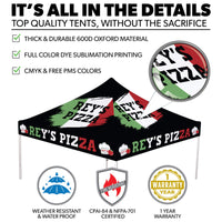 We use a dye sublimation process which gives the tent a clean and high-quality print look. This method is used with heat transfer creating vibrant colors and a special laminate layer providing additional production against UV and moisture. This printing method ensures a high-quality look and offers durability to endure normal outdoor weather conditions.