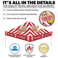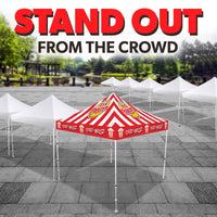 Our Custom 10x10 Canopy Tent with an overhead billboard banner offers maximum visibility and protection. Perfect for Farmers' Markets, Craft Fairs, School Events, Festivals, and any other outdoor event, this commercial-grade tent features a heavy-duty 40mm hex steel frame for durability and stability.