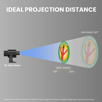 Projection distance and size will drastically vary depending on the power option selected, lighting of the event, and the distance to the desired projection surface. Fortunately, we offer 3 power options for the LookOurWay brand GOBO Logo Projectors that will project anywhere from 6 up to 100ft. Please review the specifications for each model to determine which projector is right for you