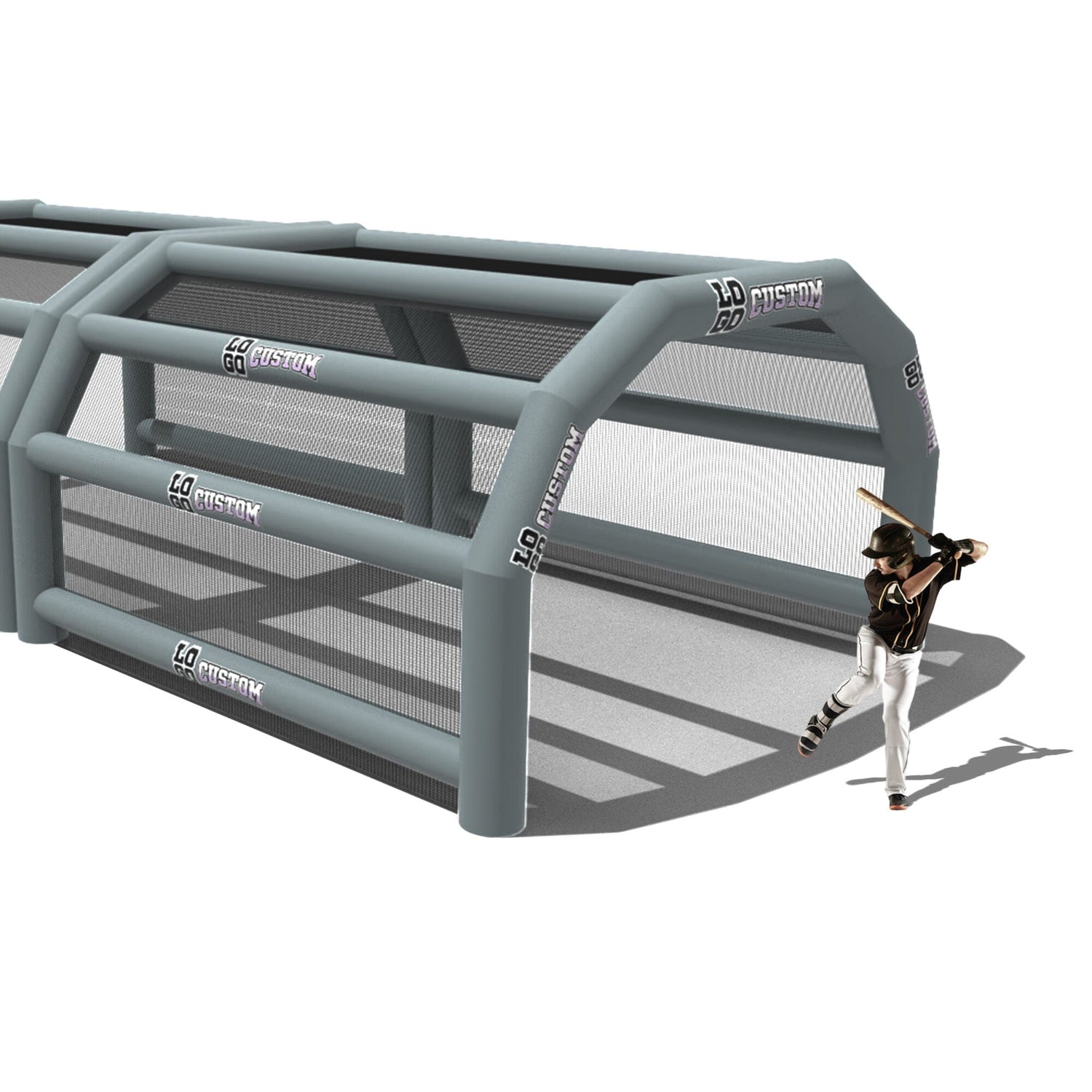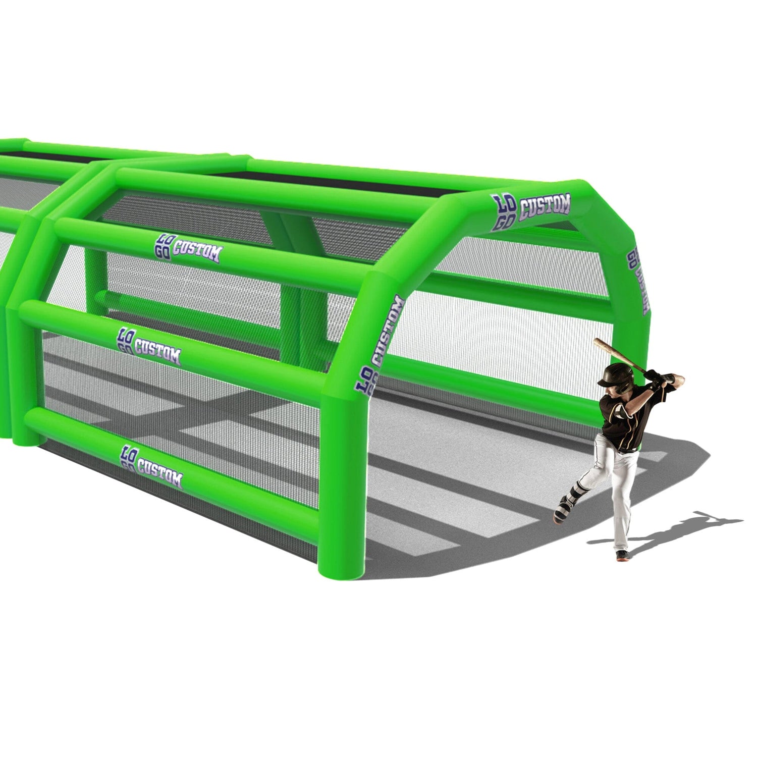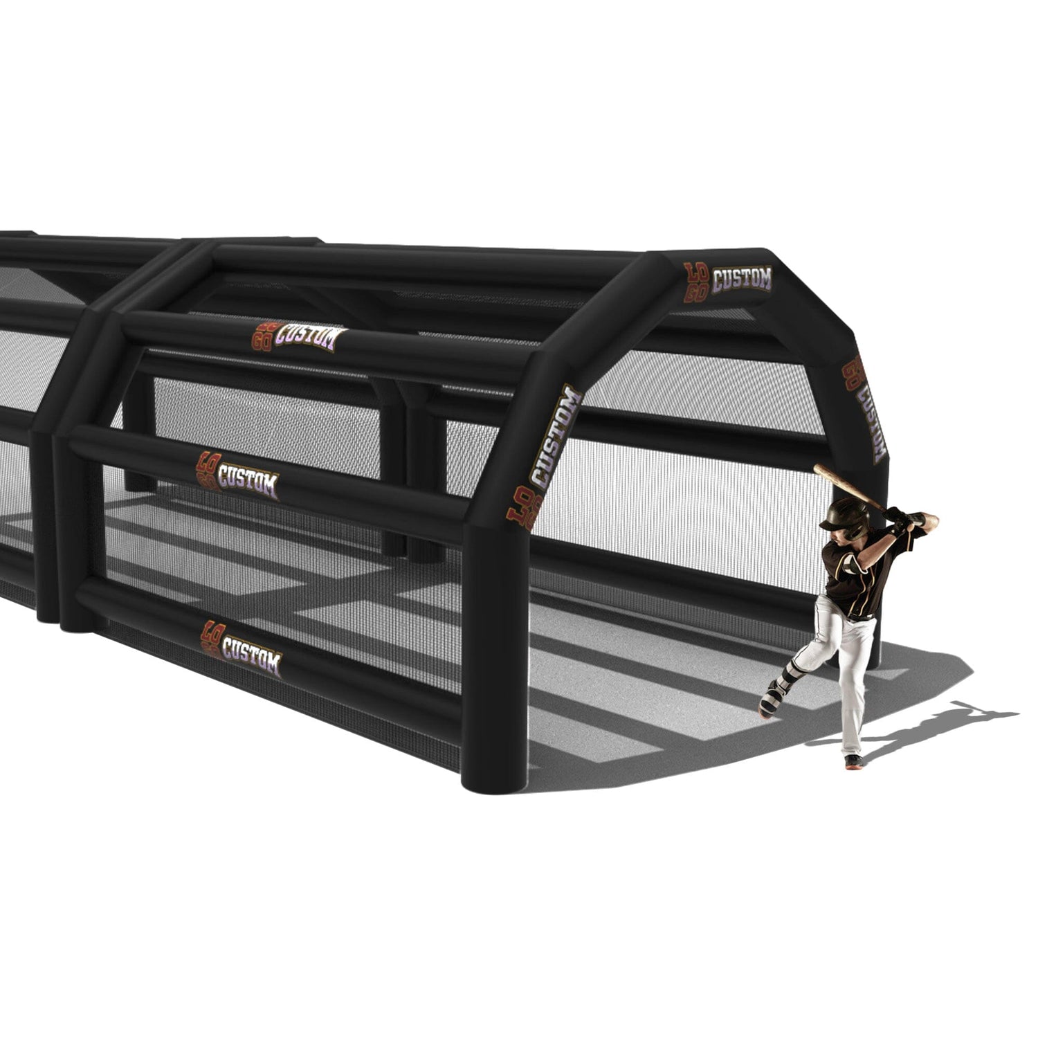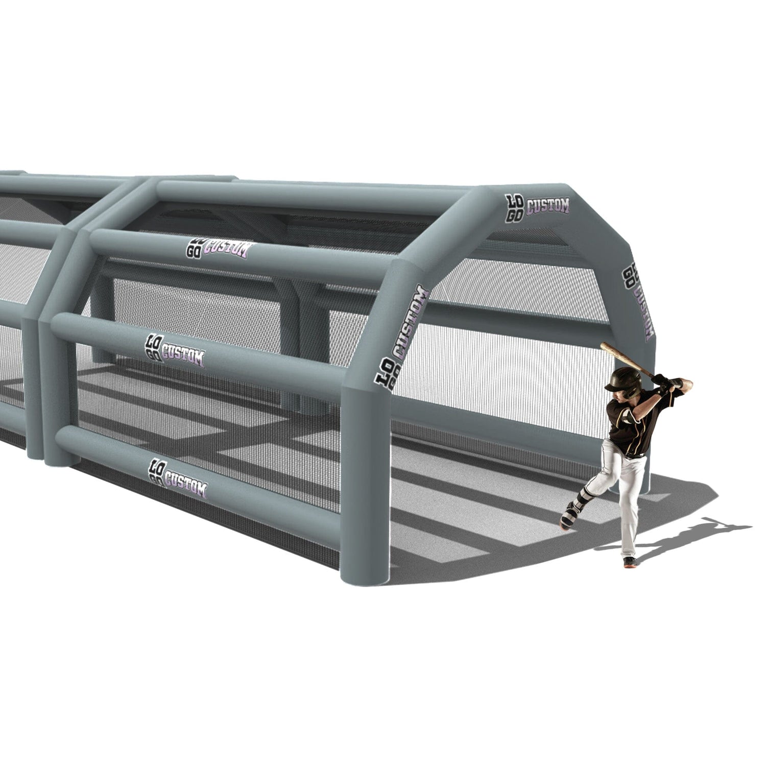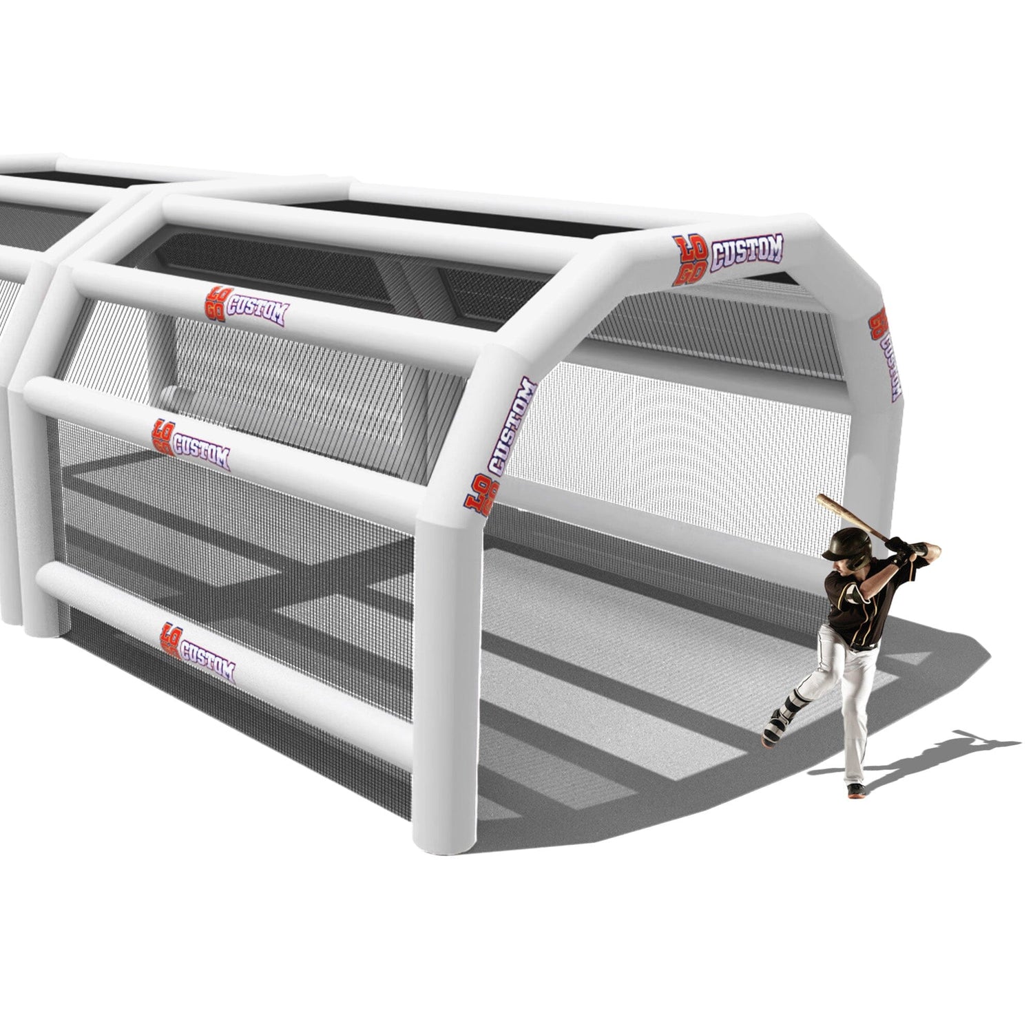 The custom Inflatable Batting Cages by LookOurWay are an exciting new way to look at the future of sporting equipment. The commercial-grade PVC construction is designed to keep your team safe in all types of weather. The popular wide frame construction is perfectly engineered to catch foul balls and wild pitches for High School, College or even Pro-level use. Best of all each backstop is fully customizable allowing you to choose between 12 popular colors, as well as logo placement. Combine multiple 20ft units to reach your desired length from 20-80ft (each sold separately)