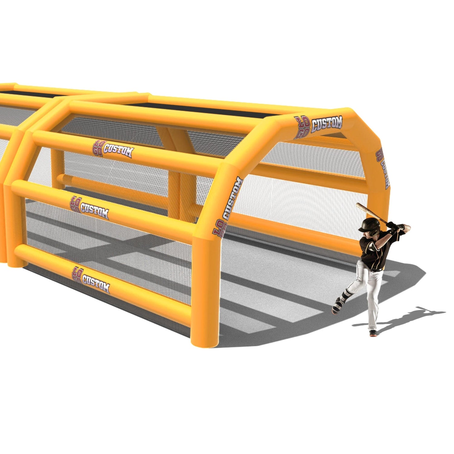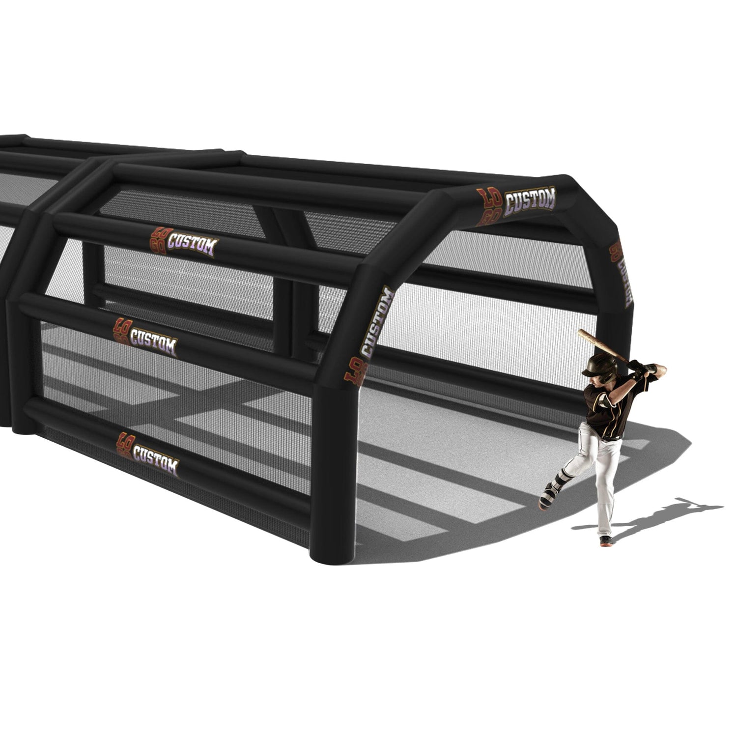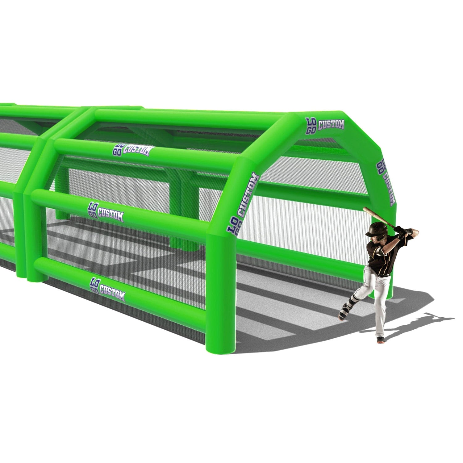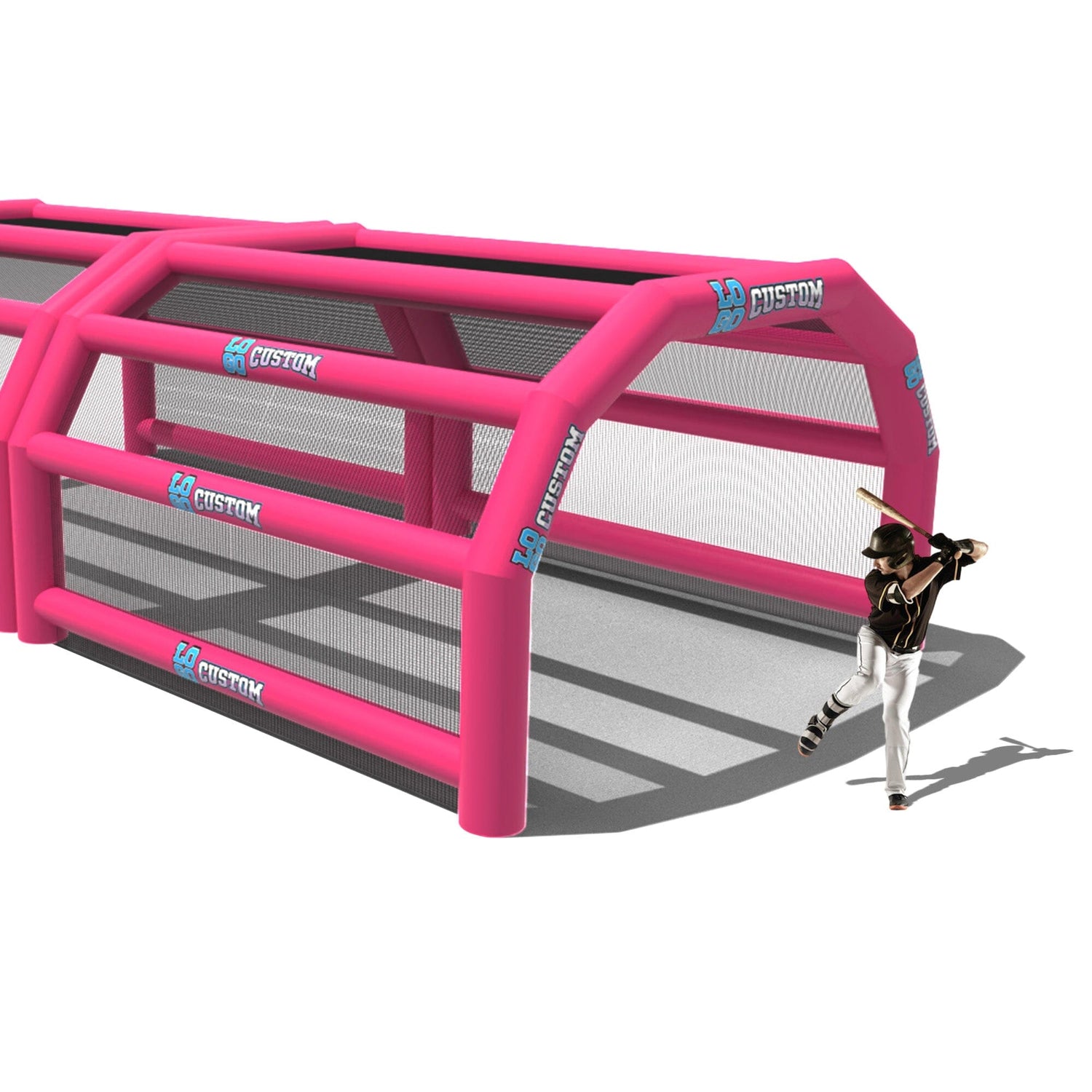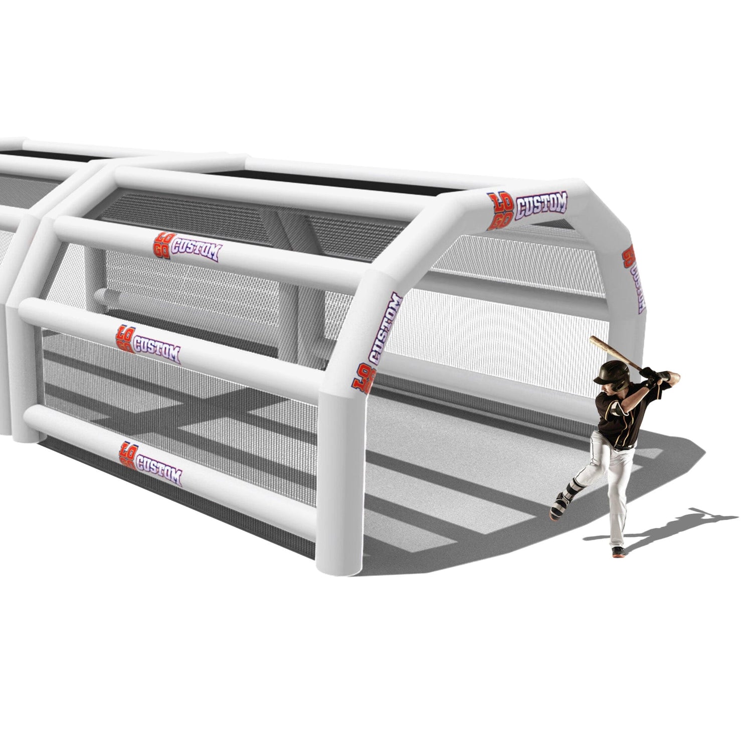 The custom Inflatable Batting Cages by LookOurWay are an exciting new way to look at the future of sporting equipment. The commercial-grade PVC construction is designed to keep your team safe in all types of weather. The popular wide frame construction is perfectly engineered to catch foul balls and wild pitches for High School, College or even Pro-level use. Best of all each backstop is fully customizable allowing you to choose between 12 popular colors, as well as logo placement. Combine multiple 20ft units to reach your desired length from 20-80ft (each sold separately)