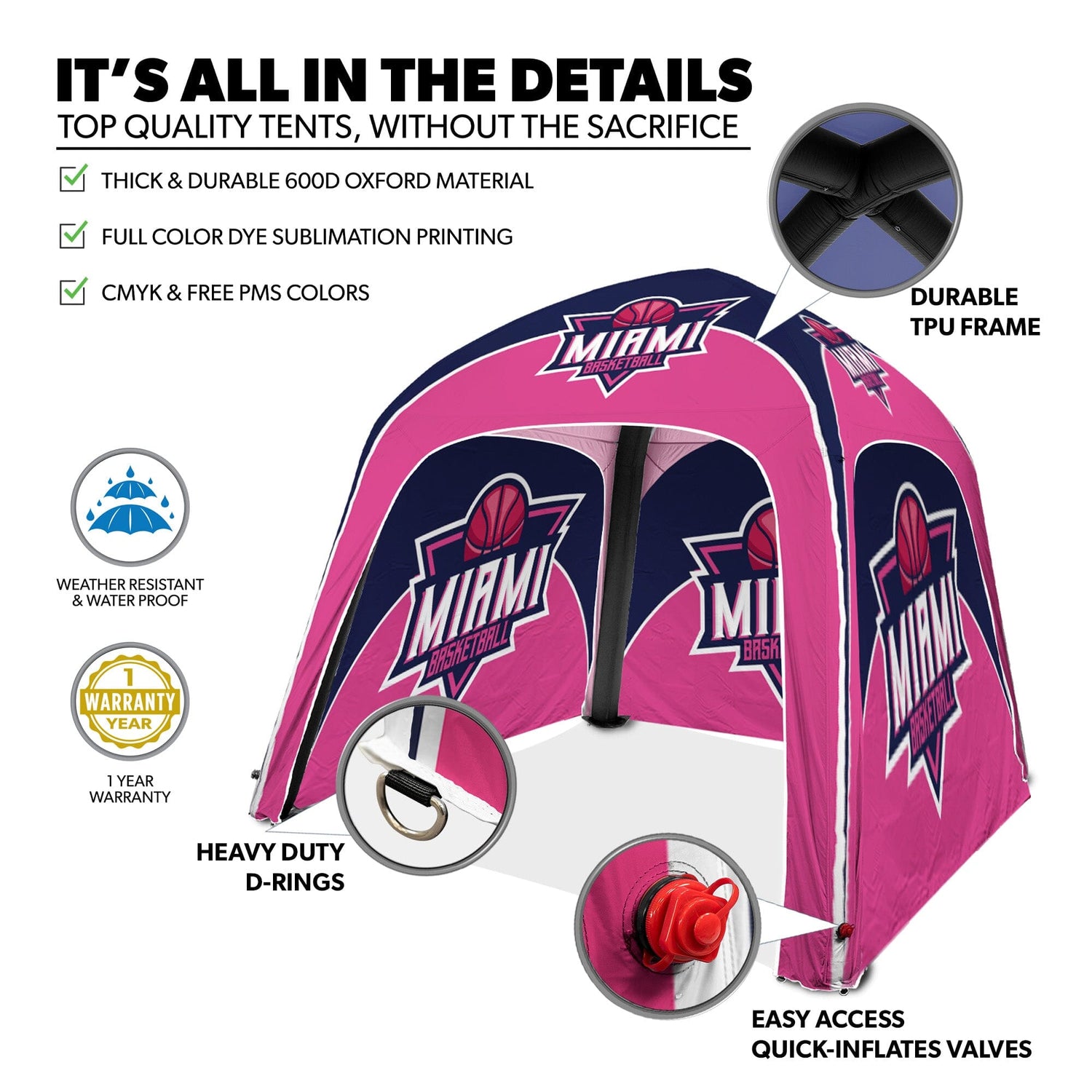 The Select Gold Inflatable Dome Tent by LookOurWay is one of the most compact and lightweight event tents on the market, weighing under 30 lbs and designed for easy, one-person setup in just 1–2 minutes. Its aerodynamic shape is hand-constructed using top-quality materials and industry-leading standards, allowing it to withstand winds up to 35 mph when properly secured. The canopy top, tent walls, and inflatable frame are all made from durable 300D polyester fabric that is UV-resistant, waterproof, flame-retardant, and wind-resistant. Each piece is printed in vibrant full color using advanced dye sublimation and hand-tailored for a perfect fit. The inflatable frame features a double-layer construction with a .2mm TPU core wrapped in 300D polyester, and can be printed to match your brand’s colors. Tent walls attach quickly with heavy-duty YKK zippers, and an optional upgrade to double-sided walls is available in the product configurator.