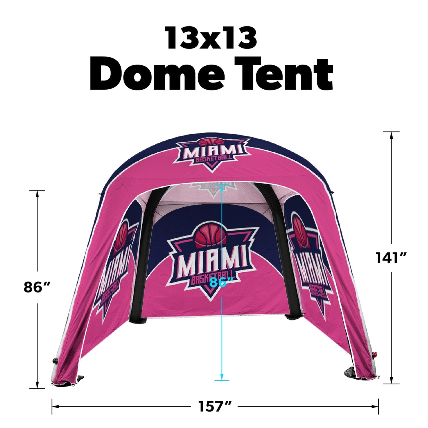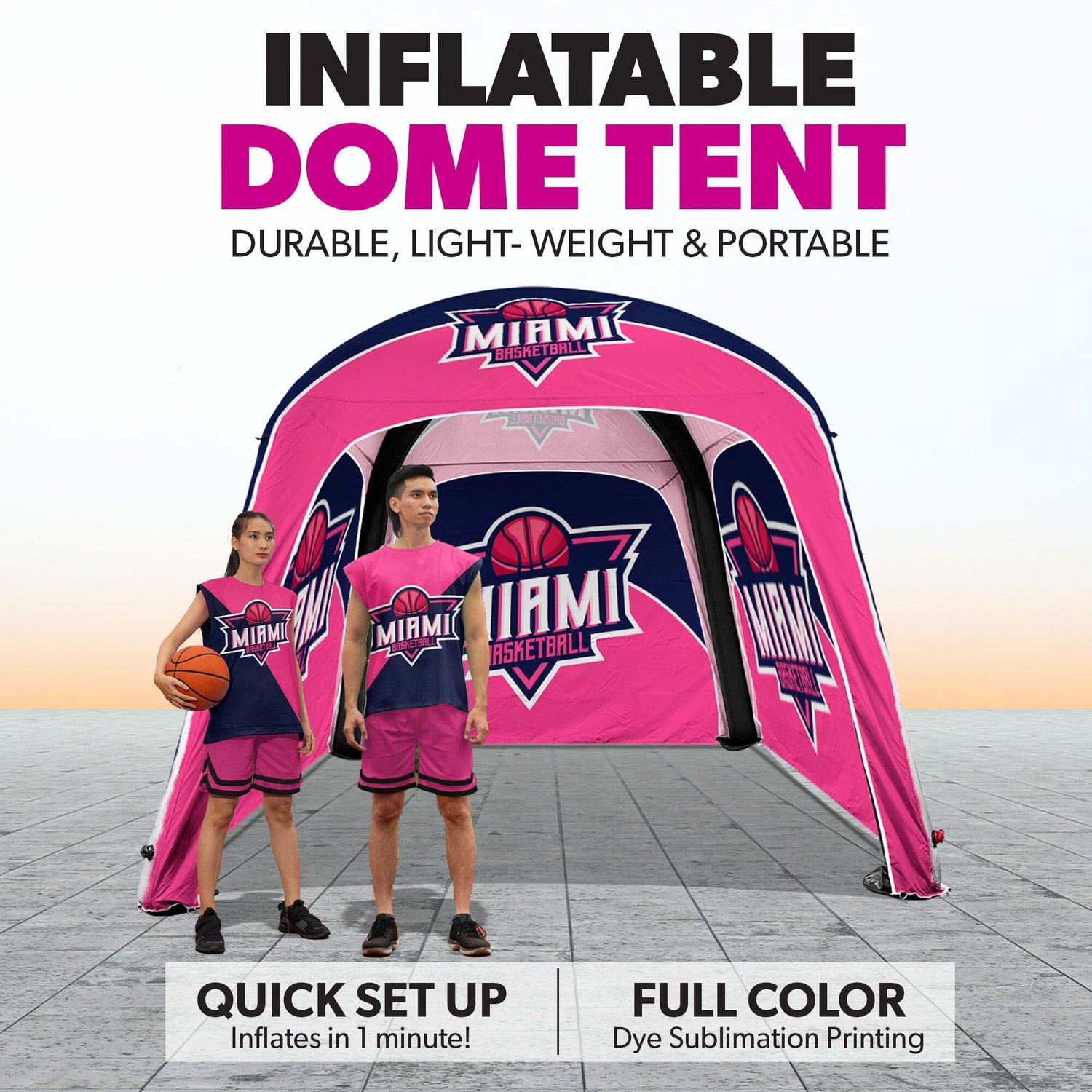 Our Inflatable Dome Tents feature a lightweight, double-layered frame constructed of a .2mm TPU Bladder that is wrapped in durable 300D polyester fabric. The Canopy top is made of full-color dye sublimated 300D Polyester Fabric