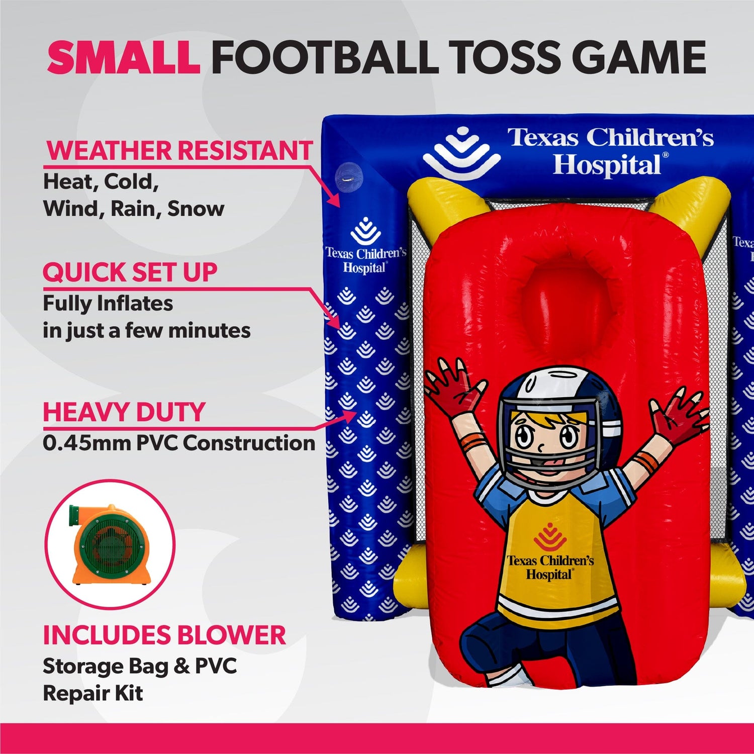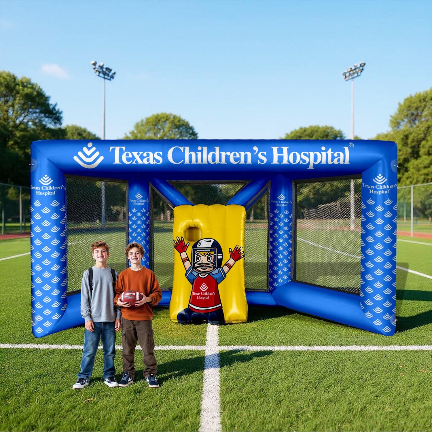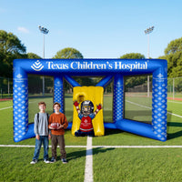 The Custom Inflatable Football Toss Game by LookOurWay is a bold, high-impact way to draw attention and drive engagement wherever your brand shows up—perfect for school carnivals, street festivals, community fairs, college tailgates, sports tournaments, and city-sponsored events. This interactive game consistently draws a crowd, creates energy, and leaves a lasting impression. Built from durable 0.45 mm PVC, it's weather-resistant and designed to handle heat, cold, wind, and rain. It sets up in just minutes, is easy to transport, and features direct UV printing for vivid, full-color branding. Available in 12 solid colors and fully customizable with your logo or messaging, it’s the ideal activation piece—especially for platinum-level sponsorships where visibility and audience interaction are key. Each unit includes a blower, carrying bag, tie-down ropes, and ground spikes—everything you need for a quick and easy setup.