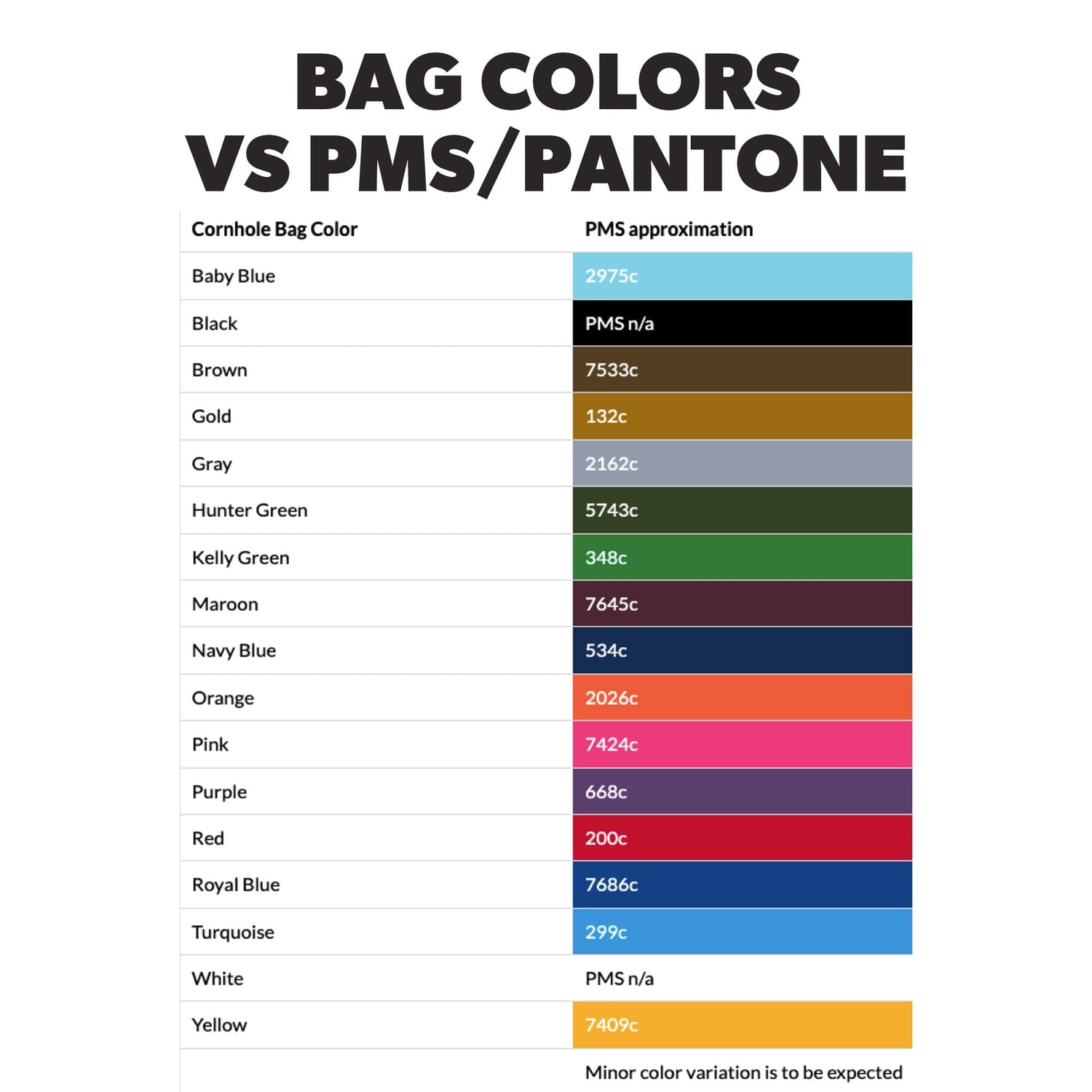 Bag Color: Our cornhole bags are available in 17 different colors. Please reference the color chart on this page and reference your desired color in the order notes.