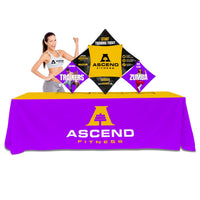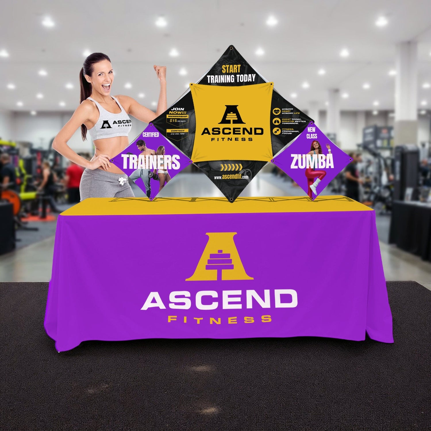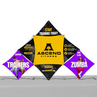 Showcase your brand in style with this 4-panel pyramid tabletop pop-up display. Measuring 58.7'' x 9.4'' x 40.6'', this unique pyramid-shaped design gives your booth a modern, dimensional look that captures attention while fitting neatly on standard trade show tables. The complete kit includes a lightweight pop-up aluminum frame, four dye-sublimated elastic polyester graphic panels, and a convenient carrying bag for easy portability.