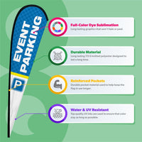 Available in 7ft, 9ft, and 12ft sizes, these teardrop banners are perfect for retail promotions, outdoor festivals, trade shows, and more. Line them up for a bold, professional look that draws in the crowds and amplifies your brand presence.