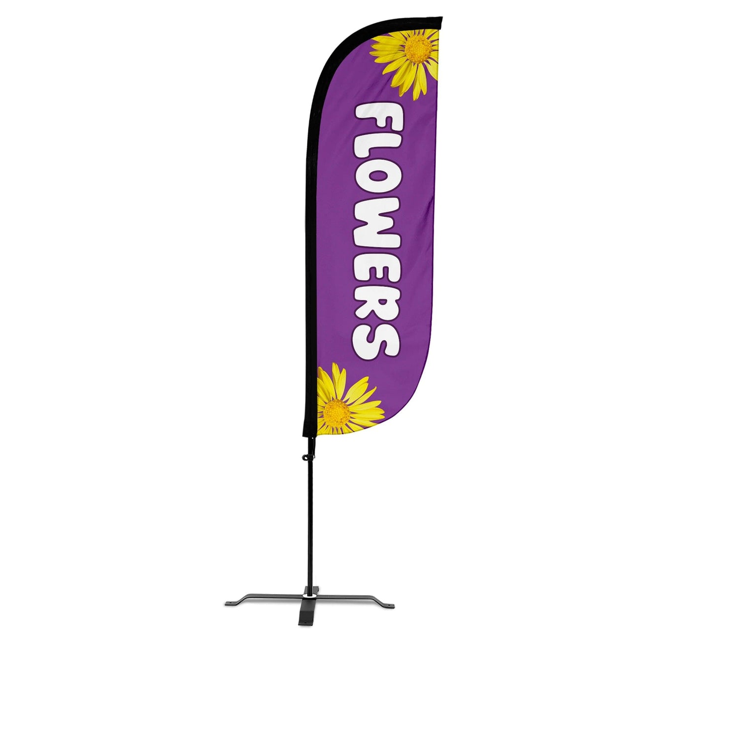 Turn your storefront or sidewalk into a floral magnet with this vibrant purple feather flag featuring bold white “FLOWERS” lettering and two cheerful yellow flower graphics—one at the top and one at the bottom. Designed to catch eyes and attract flower lovers from near and far, it’s the perfect way to boost visibility for florists, garden centers, farmers markets, or pop-up flower stands.
