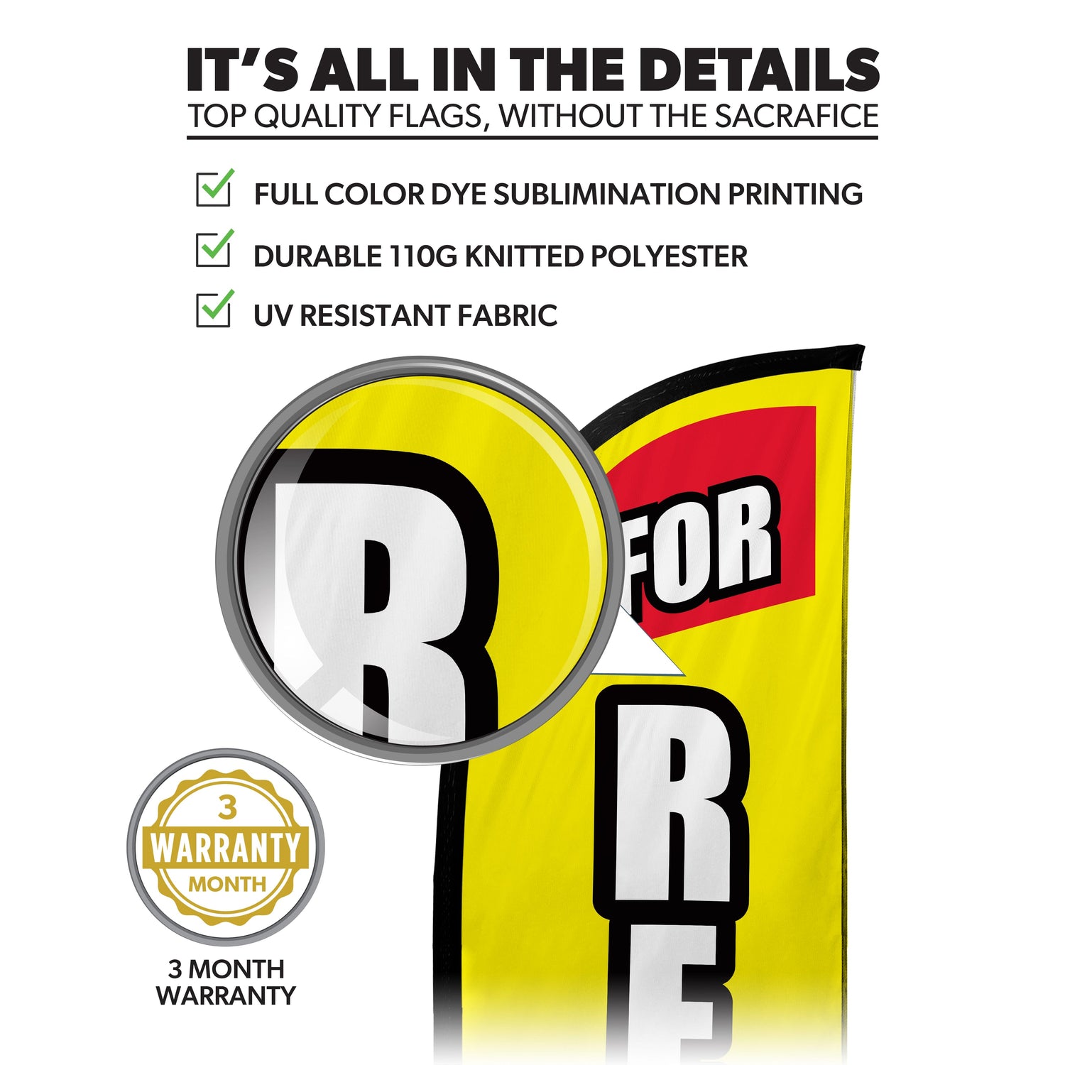 With a bright yellow background, some red details, and bold white lettering lined in black, this flag is designed for maximum visibility. Choose the 5-foot size or the 12-foot size. We also offer different poles to help you anchor your banner flag outside or set it up on indoor or outdoor walkways.