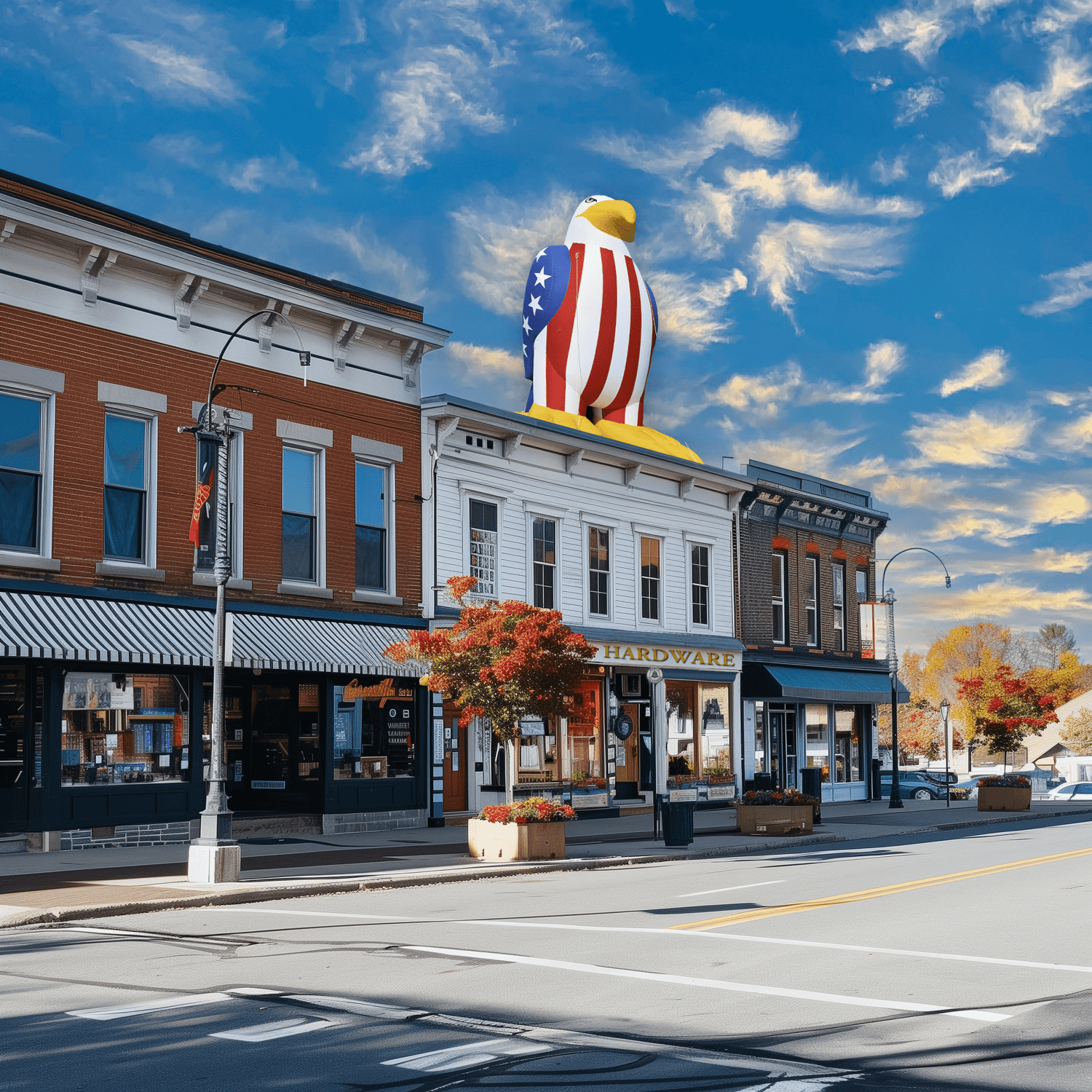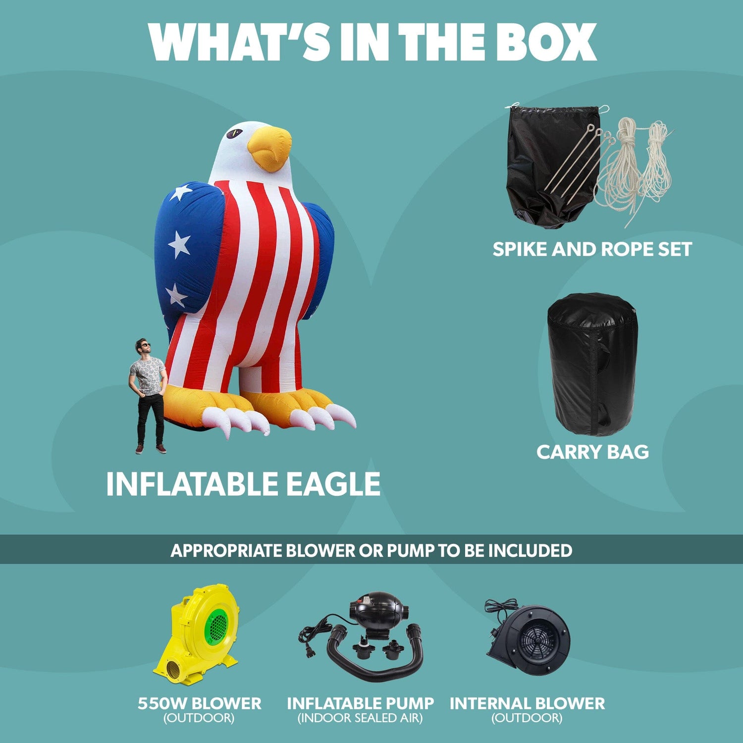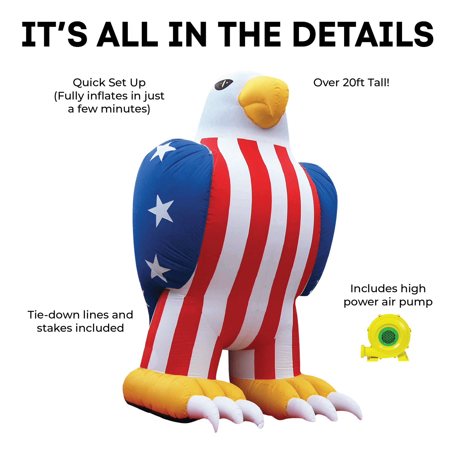 20ft Tall Patriotic Inflatable Eagle – Giant American Eagle for Events & Promotions. Show your patriotic pride and command attention with the 20ft Tall Giant Inflatable Eagle from LookOurWay. Featuring a bold red, white, and blue American flag design, this towering inflatable eagle is the perfect centerpiece for Fourth of July events, military celebrations, veterans' fundraisers, or any patriotic-themed promotion.