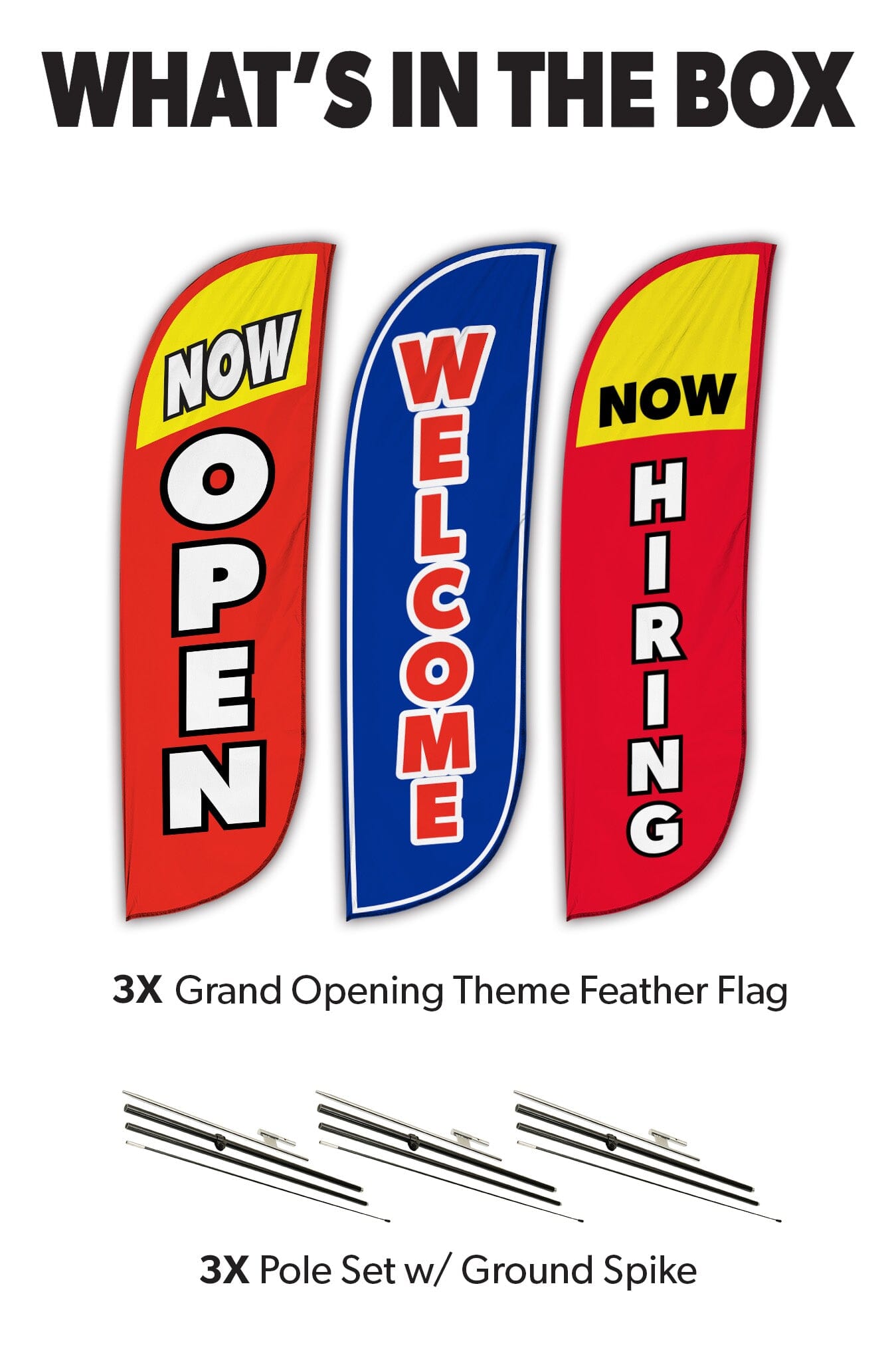 Grand Opening Feather Flag - Variety 3-Pack V1 w/ Ground Spike Pole Set