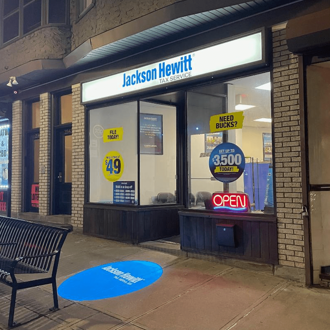 The GOBO Logo Projector by LookOurWay will light up your Jackson Hewitt Tax Services franchise in a BIG way. With 3 popular power options to choose from and projection capabilities of up to 100ft. These powerful advertising tools will ensure that your brand is getting the attention that it deserves by projecting the Jackson Hewitt logo onto your desired surface.