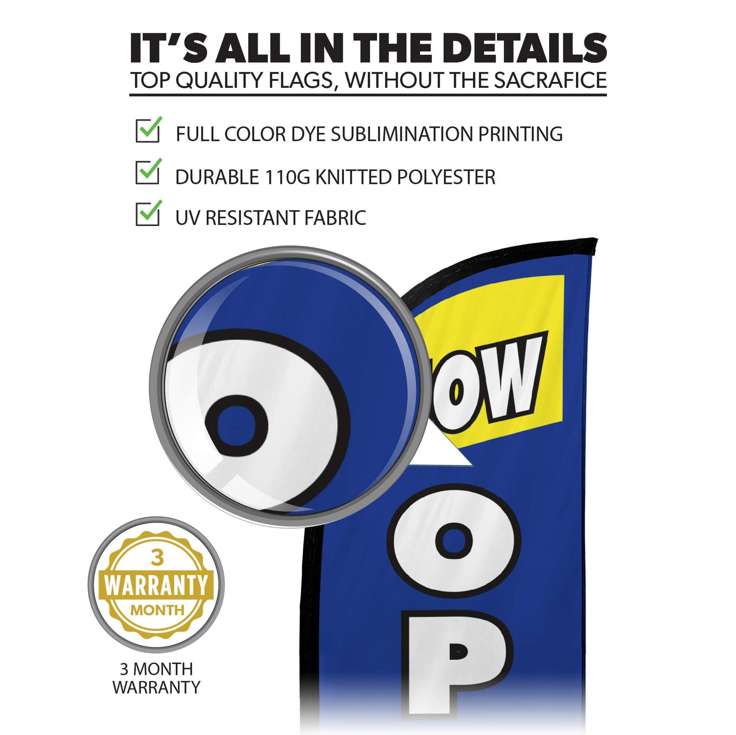 Available in two vibrant color designs – red & yellow with white lettering or blue & yellow with white lettering – this feather flag is impossible to miss. The bold colors and large text ensure maximum readability from the street, sidewalk, or parking lot.