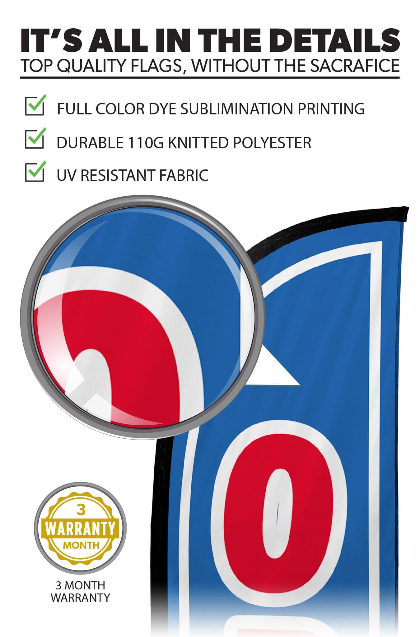 All our flags are made with durable, knitted polyester. Our predesigned options are available in 115g polyester and custom flags are available in 100g material. This material is UV-resistant and rated for wind speeds up to 25 mph. The material is also weather-resistant, but we recommend not displaying our flags outdoors on rainy or snowy days to extend their lifespan.