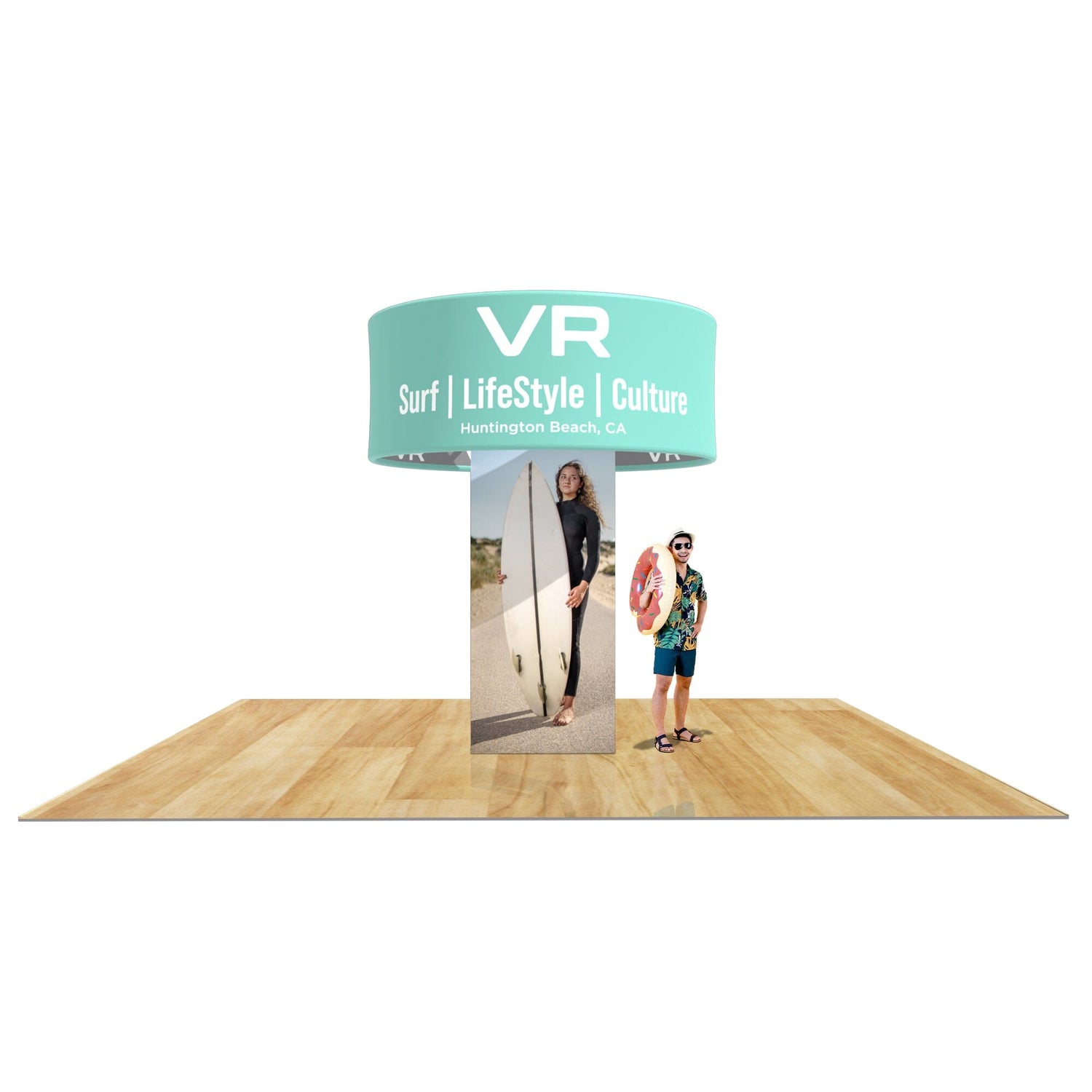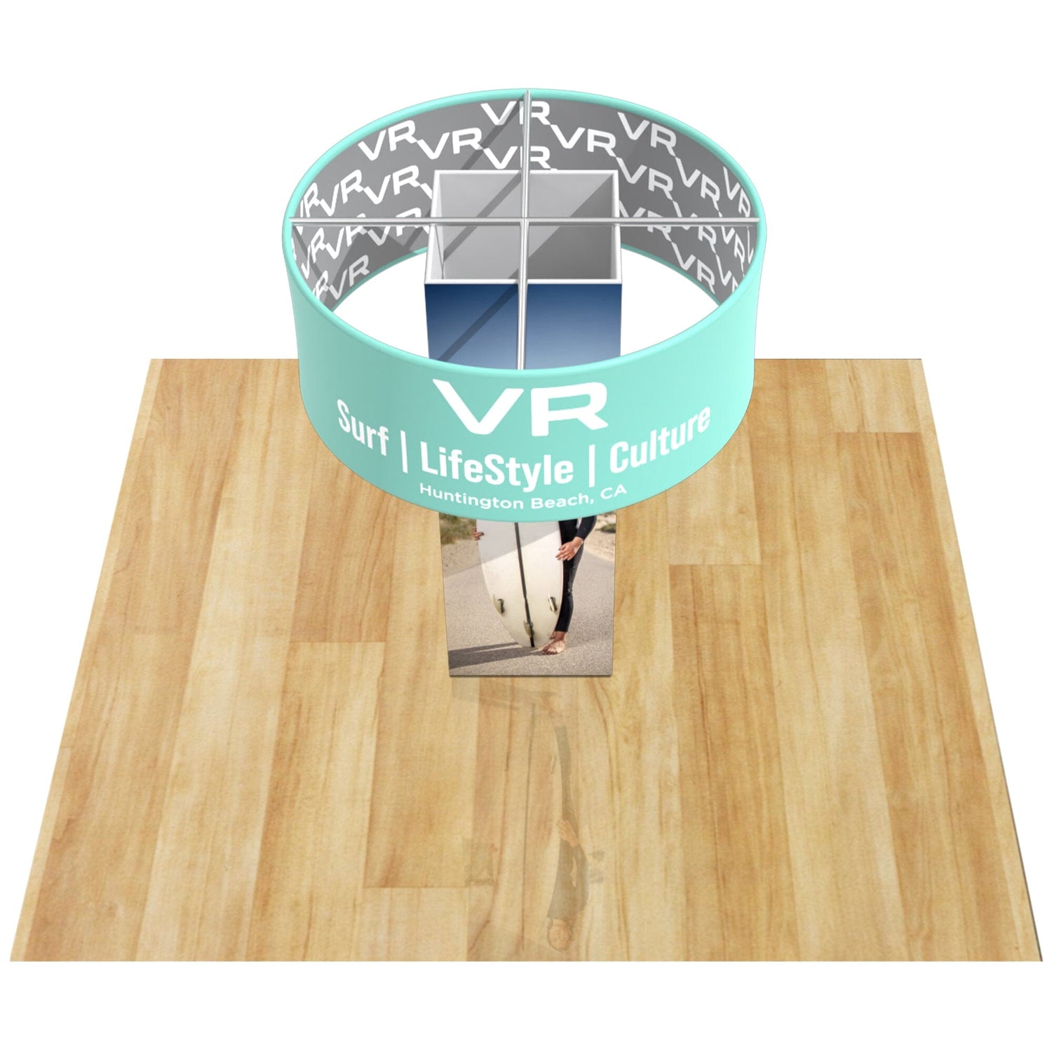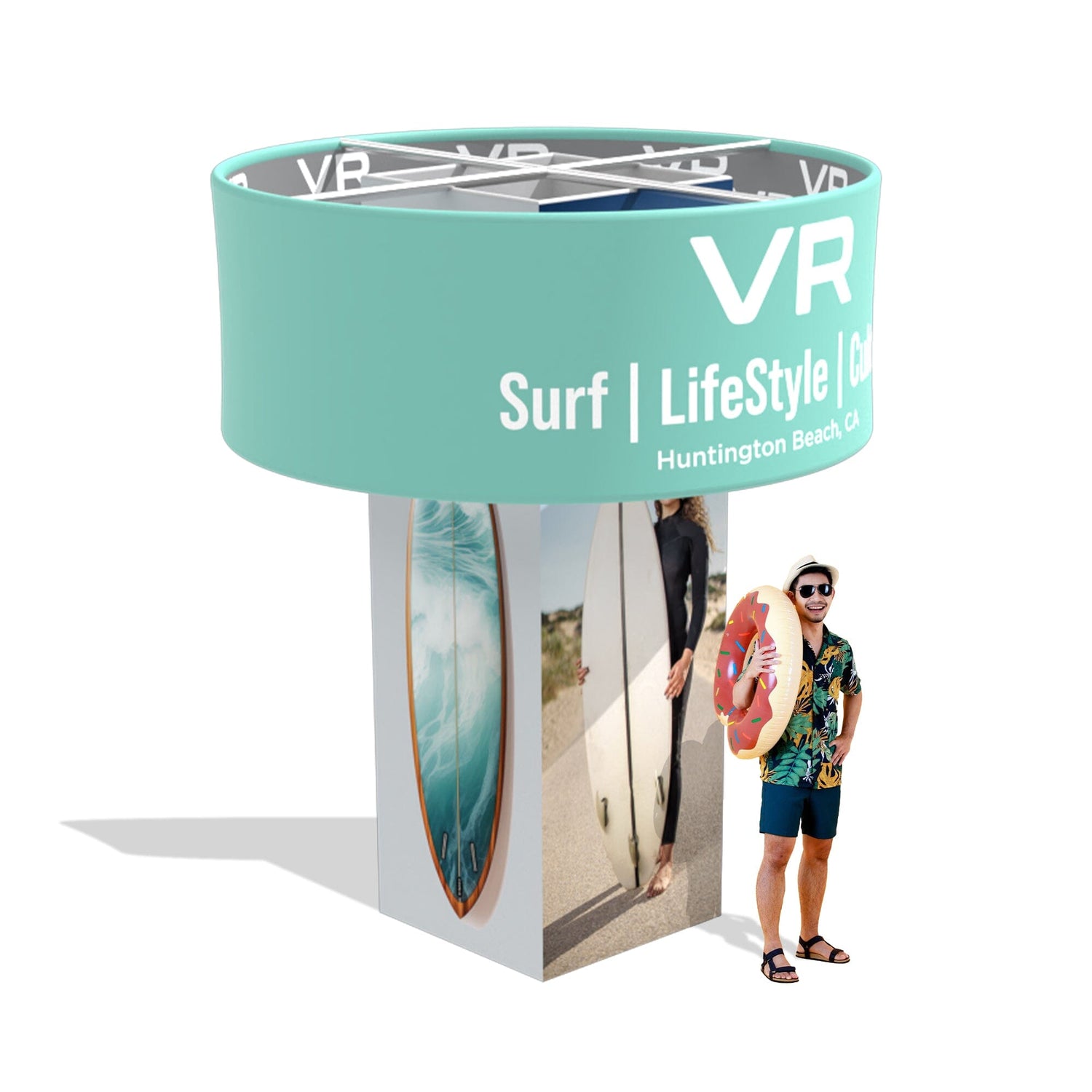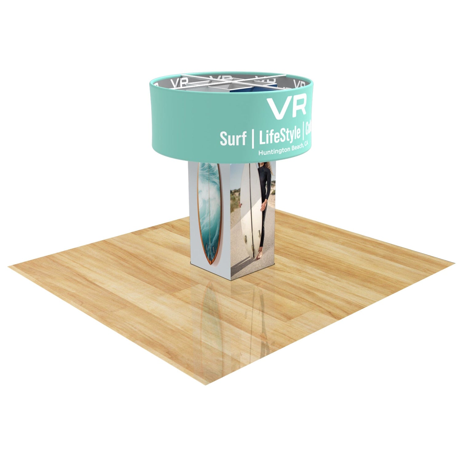 The Frames for both the Trade Show column and The hanging banner are constructed of 32mm Round Aluminum Poles. They are both wrapped in premium 8oz Tension Fabric that is printed in full color using our industry-leading dye sublimation process.