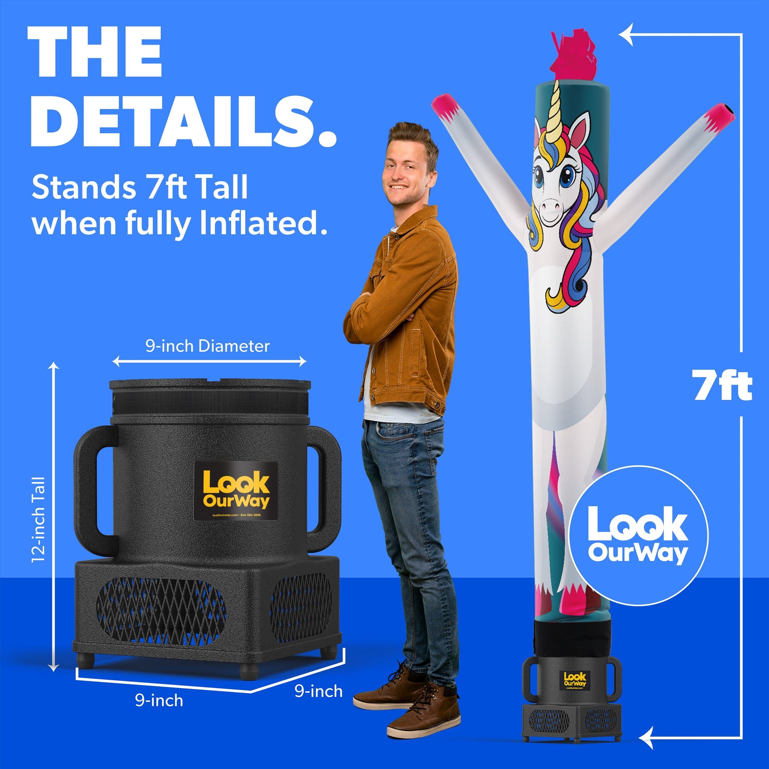 Bring magic and color to your next promotion with the 6ft Unicorn Air Dancer® from LookOurWay! This whimsical inflatable features a bright white unicorn body, flowing rainbow hair, and a double-sided design that ensures it’s visible from all angles. Standing 6 feet tall, it’s perfect for businesses, events, birthday parties, aquariums, zoos, or themed promotions that want to capture attention.