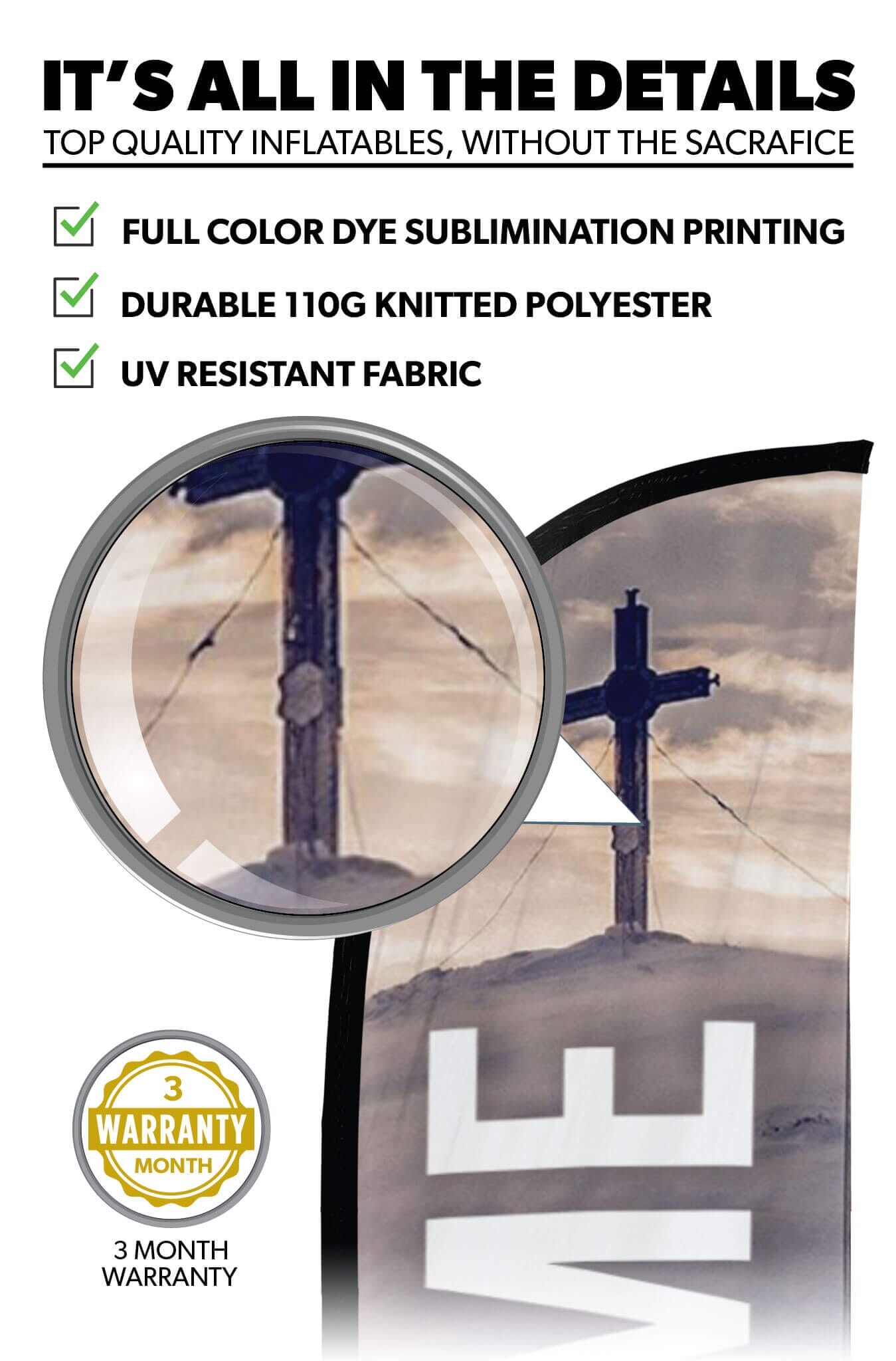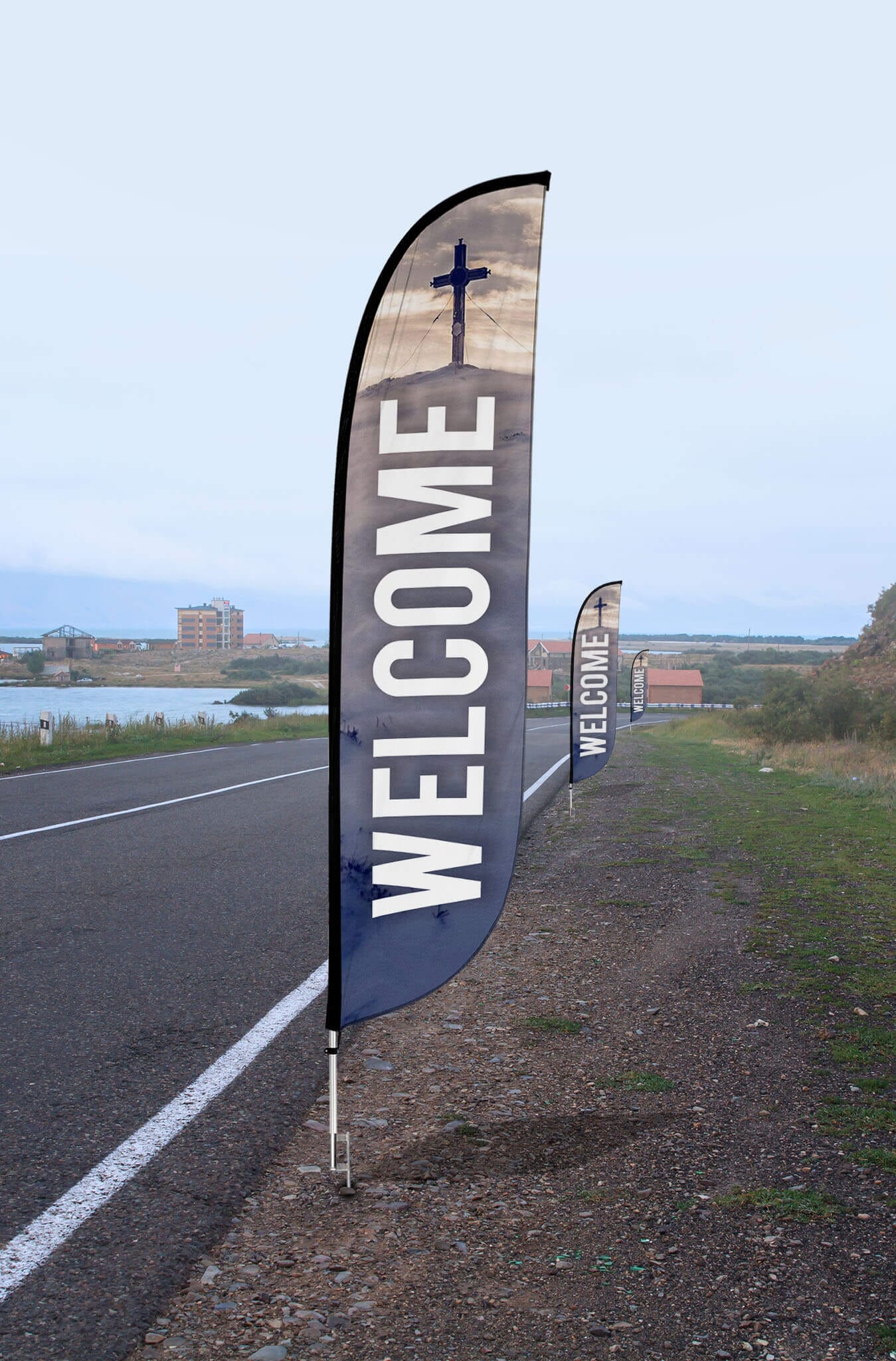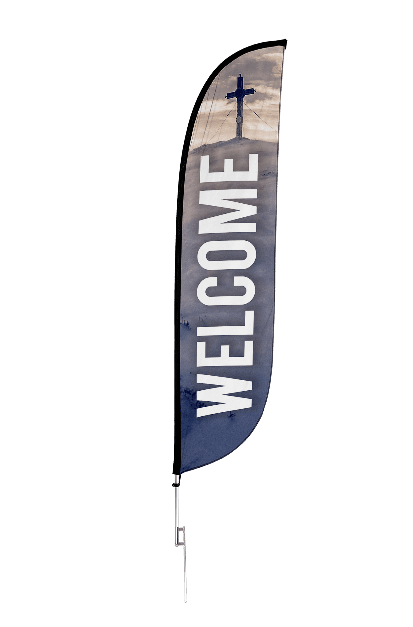 The "Welcome" Church feather flag has a moving and dramatic design theme that includes a cross atop a snowy mountain. This digitally printed advertising banner has the word "WELCOME" displayed in white that stands out visibly against the eye-catching background. Be sure to add a pole set from the dropdown above, pole sets are required for use.